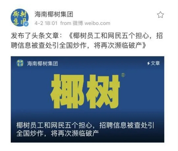 遭遇了三大央媒口诛笔伐,本以为椰树集团会就此妥协,可是没想到椰树集团并没有被吓到,反而“镇定自若”地和央视媒体刚了起来。椰树集团首先将这条招聘广告置顶,可以说是赤裸裸地挑衅。更让人震惊的是,4月2日,椰树椰汁在微博和官网发了一篇惊世骇俗的公关文进行有力回击。在这篇标题为《椰树员工担心招聘信息被查炒作将濒临破产》的长文中,椰树集团可谓是引经据典,在文中举例了1979年有关首都机场壁画的故事。还阐述了员工和网民的“五个担心”,寄托了“两个希望”,实力硬钢。五是担心“椰树”1981年-1985年连续五年亏损、仅差两万元就濒临破产、员工发不出工资的惨状再现,6000多员工再次吃苦。