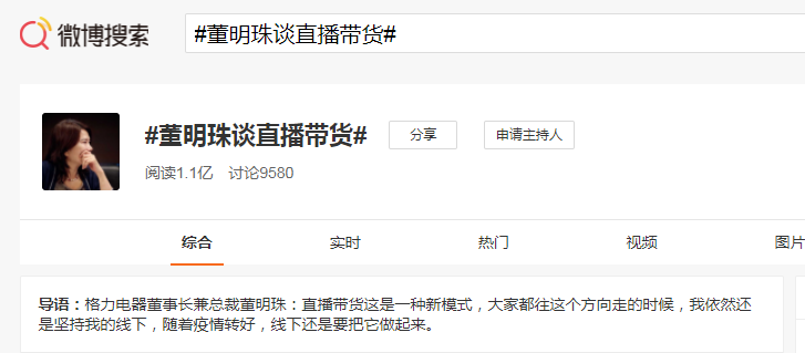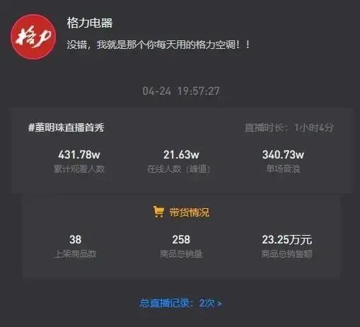 可能很多人不会想到,曾经和雷军“豪赌”十亿的董小姐有一天走上电商直播的道路。但董明珠有自己的一套逻辑,疫情改变了人们的消费方式,直播带货也的确是一种值得尝试的新模式,但她依然会重视“线下”。从她本人的表述来看,董明珠希望寻求一个以万家门店体验为主的、更完美的营销方式。如果你当天走进了董明珠的直播间,会发现董小姐的这场直播相当另类。直播间没有半价大牌商品,也没有百万疯狂补贴。在短短1个小时的直播里,董明珠与抖音网红主播“小小莎”以“走播对谈”的方式,除了带领观众逛了一圈格力电器的总部展厅,全线展示了覆盖家庭方方面面的生活电器外,并没有像网红主播那样兴致勃勃地去吆喝带货。从形式上就能看出,与其说这次直播是一场带货实力的比拼,不如说是格力对自身技术实力的大秀。每一个“安利”都透着技术流的气魄,而不是全网最低价的诱惑。尽管2020年整个家电行业都因疫情萎靡不振,可董明珠亮相抖音直播依然引爆了全国观众的好奇心,在直播过程中几乎没有跌出过小时榜前3名,数次冲上抖音直播小时榜榜首,影响力可见一斑。据新抖后台数据显示,董明珠直播首秀当晚累计观看431.78万,在线人数峰值21.63万,商品销售额22.53万元,算是总裁中的“头部主播”。如果你抱以一场“直播带货”的标准来衡量,这样的销售结果当然是扑街的。但我们从这场直播的形式来看,带货显然不是董小姐的目的。再加上家电这类产品的特殊性,显然不能以动辄数十个品牌产品的快消品的直播带货标准来去单纯的比较。毕竟,如果不是正好需要,没有人会去冲动购买空调、洗衣机,更不会有人去囤货。这样的道理,董小姐和抖音在做这场直播前肯定会考虑到。但不可否认,在整场直播中,董明珠的人气非常高,1个小时时间里,有2.14万人送礼。唯一美中不足的是,整场直播由于技术问题,直播信号不断出现“翻车”事故,画面多次卡顿、中断,网友一直在喊“卡卡卡,太卡了...”。但我现在更倾向于“阴谋论”的认为这是一场精心设计的“技术性”失误。毕竟,此前董明珠在央视财经节目中谈“直播带货”,被很多人误解为“格力不做直播带货”,在微博引起了热议。话题#董明珠谈直播带货#阅读人次已达到1.1亿。而董明珠官宣将参与直播后,“剧情反转”让该话题的热度再次达到顶峰。再加上这两天网友们的“多级传播”力直接让这场直播的影响力穿透进了更大的大众圈层,而非局限于抖音本身。