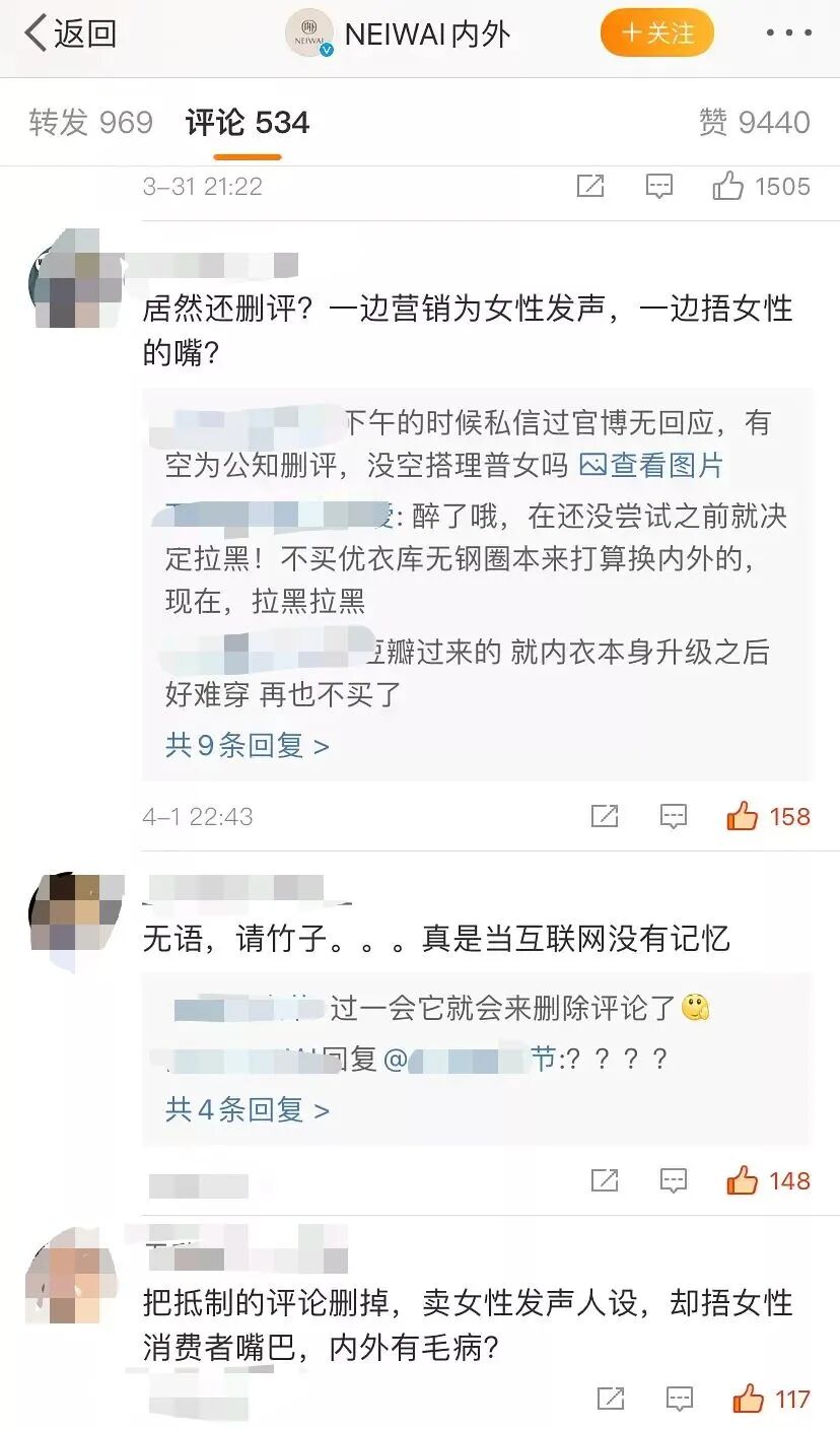 要知道,在互联网时代,最忌讳的就是捂嘴。越不让说话,人们就越逆反,越要表达自己的愤怒。而内外竟然想要靠着删评、删帖就堵住悠悠之口?请问内外公关部,你们是解决问题还是在火上浇油?这是在用脚公关吗?随后,可能负面评论实在太多,内外干脆又设置了仅用户关注才能回复,也就是想要骂内外,必须关注它,这不是更恶心人吗?内外的这一波操作,大大激怒了很多忠实的品牌用户,很多网友和KOL开始自发用#内外NEIWAI翻车#、#内外两面派 你好竹子#等话题发微博谴责。