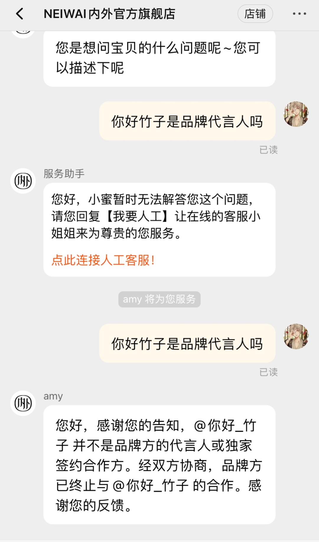 而直到4月4日上午,有网友去咨询内外的淘宝客服,才得到回应:“经双方协商,品牌方已终止与你好_竹子的合作。”与此同时,内外还将官宣的微博设为仅自己可见,并删除了公众号的相关推文,整个事件的舆情发酵才告一段落。