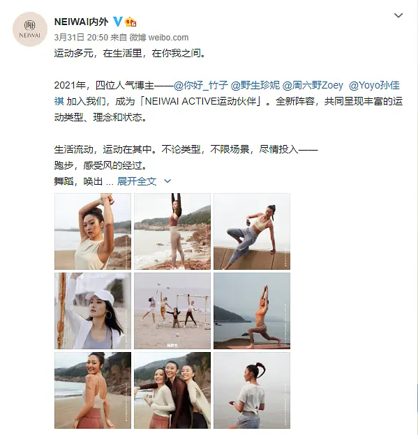 前几天,内外为了推广品牌的运动内衣,在微博官宣了四位KOL进行合作,包括@你好_竹子、@野生珍妮、@周六野Zoey、@Yoyo孙佳祺,都是有上百万粉丝的女性运动、时尚博主。但随即,就有网友指出了KOL@你好_竹子过往曾经让人不齿的言论。公开“支持代孕”,说自己赚钱就是为了攒钱冻卵、代孕、找保姆。在微博对疫情中的英国人“说抱歉”。有网友指出“病毒并不一定起源于中国”,她就怼“请拿到确切证据再这么说好么”。“领土纷争从不存在对错,也分不出对错,这又不是自然科学”、“日本是个很伟大的民族”、“关于反日的微博我都不敢看”。字里行间都是对日本的崇拜,对同胞的贬低。而就是这样一个劣迹斑斑、满嘴跑火车的KOL,内外竟然从众多女性博主中把她挑选了出来,选择和她合作。作为一个一直传达女性价值的品牌,内外这一步,真的是作大死。