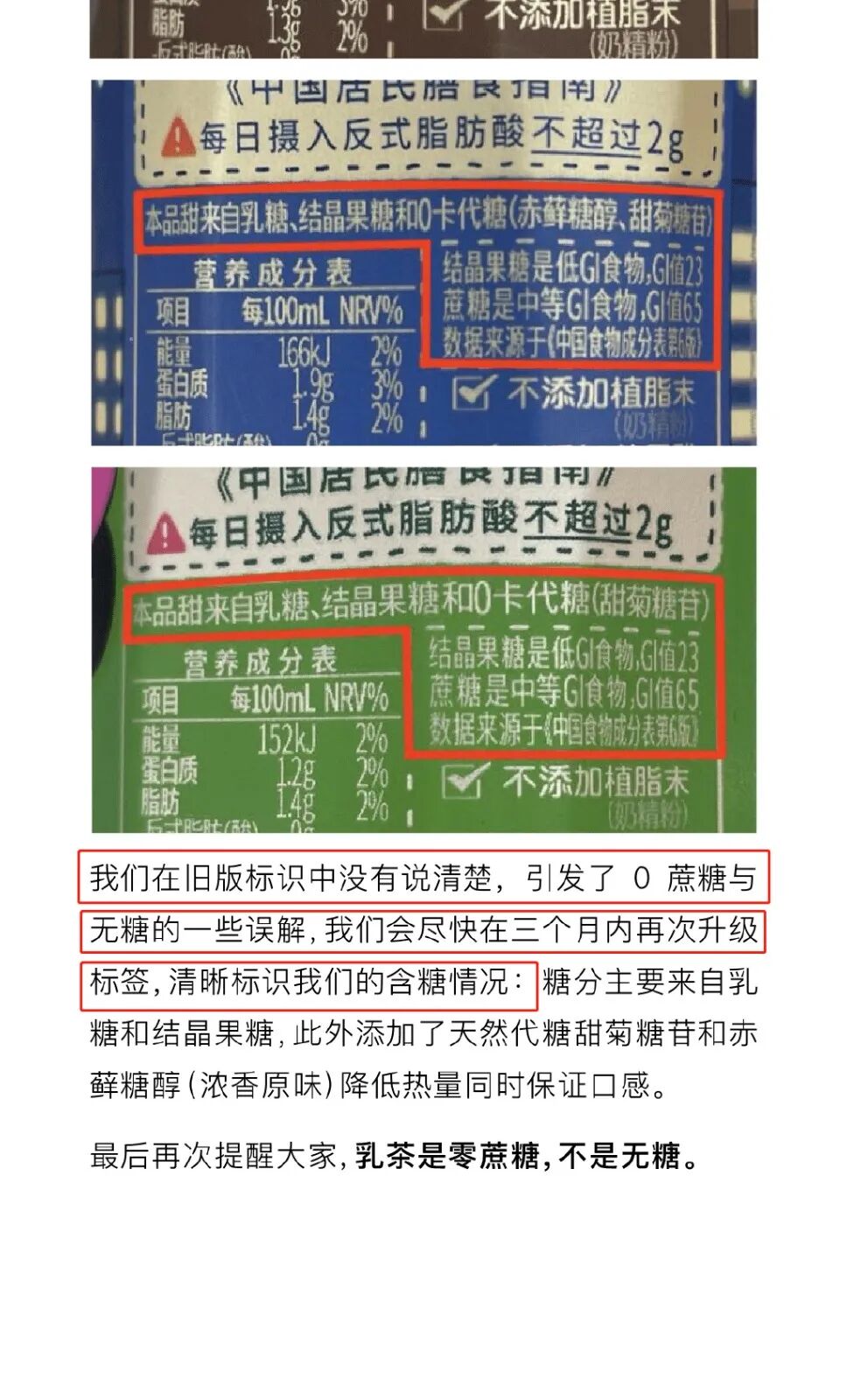 回到元气森林乳茶本身,一方面,旧包装的配料表里添加了结晶果糖;另一方面乳茶本身含有牛奶,自然也就有乳糖。