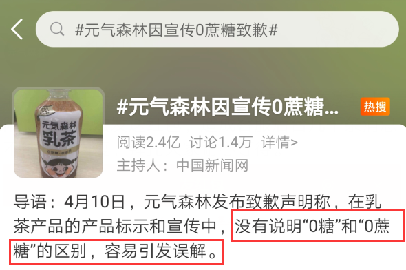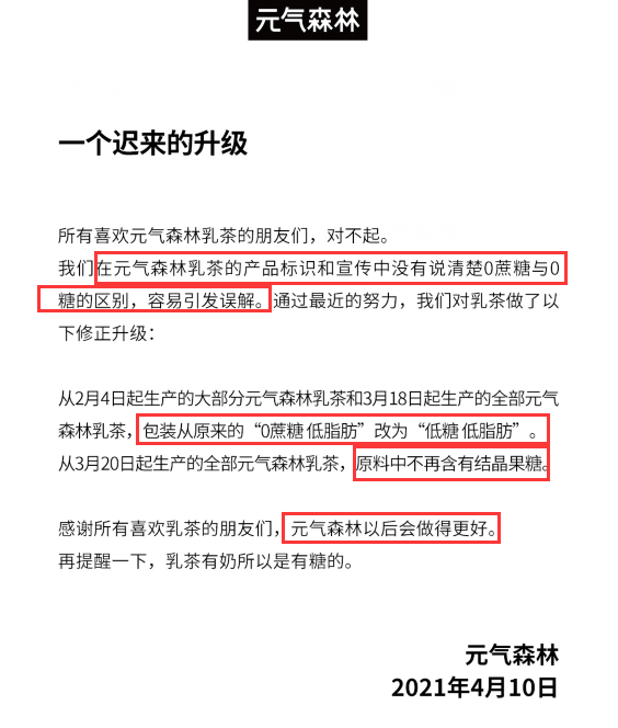 4月10日,元气森林在官微发布致歉声明《一个迟来的升级》,就产品宣传没有说明“0糖”和“0蔗糖”区别而道歉,还说明了目前包装改进的进度。