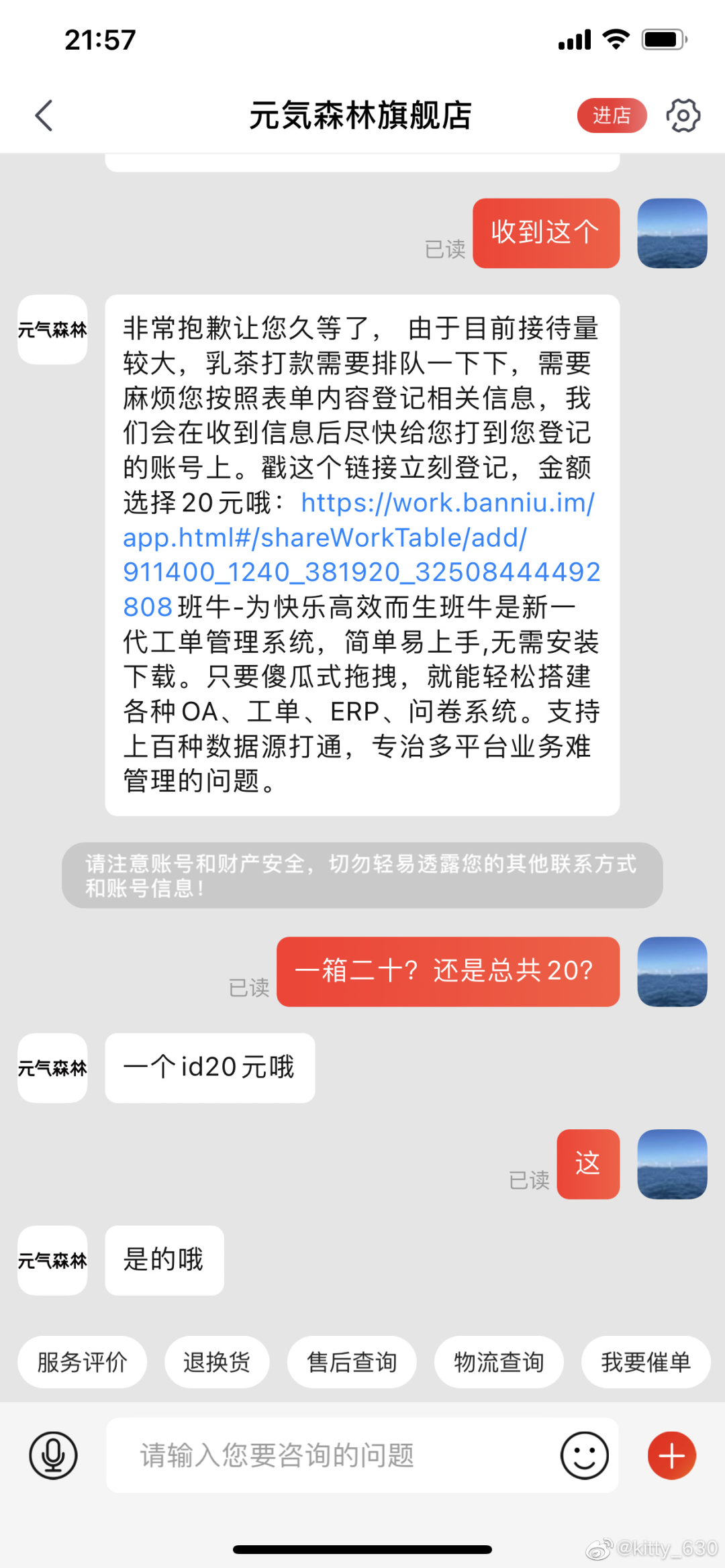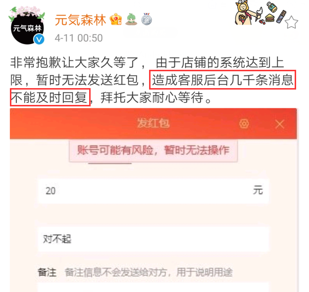 除了发布道歉声明,元气森林也推出了具体的补偿方案。只要在电商官方店铺买过乳茶的用户,可以联系店铺客服,领取20元现金红包,对拆箱、未拆箱乳茶进行无条件退货。