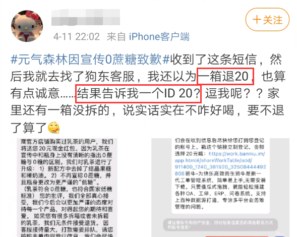 虽然元气森林有诚意挽回消费者,但补偿细节做得不尽如人意,又引发一波吐槽。有人以为一箱补偿20元,后来发现原来是一个ID补偿20元。