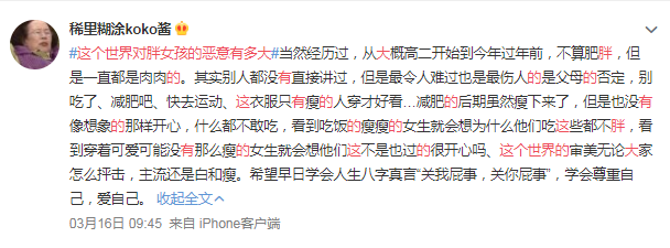 虽然大众嘴上说着女性的美不止一种,但键盘却很诚实。在#这个世界对胖女孩的恶意有多大#的微博话题下,有人因为胖一度想崩溃自s ,有人因为胖遭到了来自父母的否定。