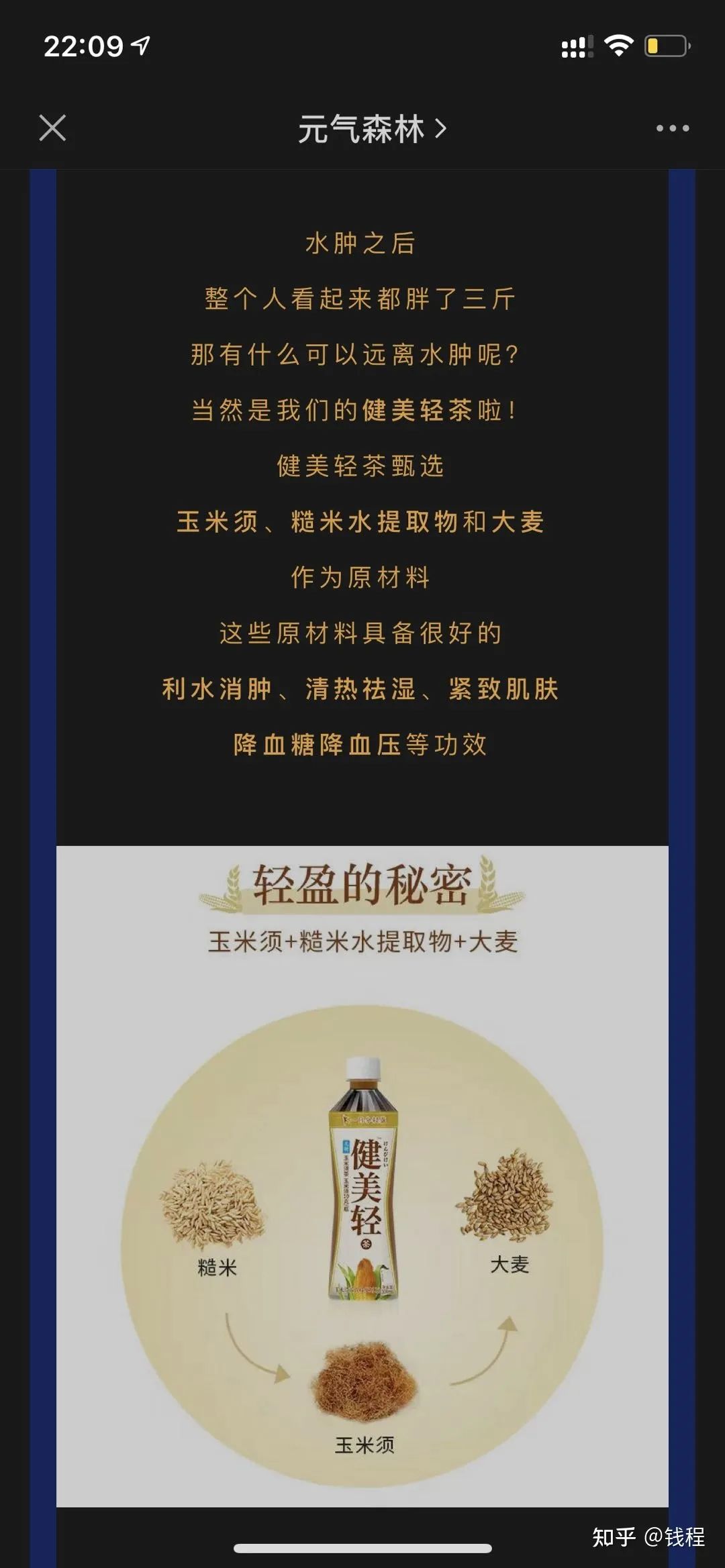 因为在元气森林的其他产品上,一位名为钱程的知乎食品饮料业大V就对「健美轻」玉米须茶提出质疑,表示从「消除水肿,降血糖,降血压」等(并不存在的)功效上进行宣传,也存在以「擦边球」的方式绕过法规的虚假宣传。