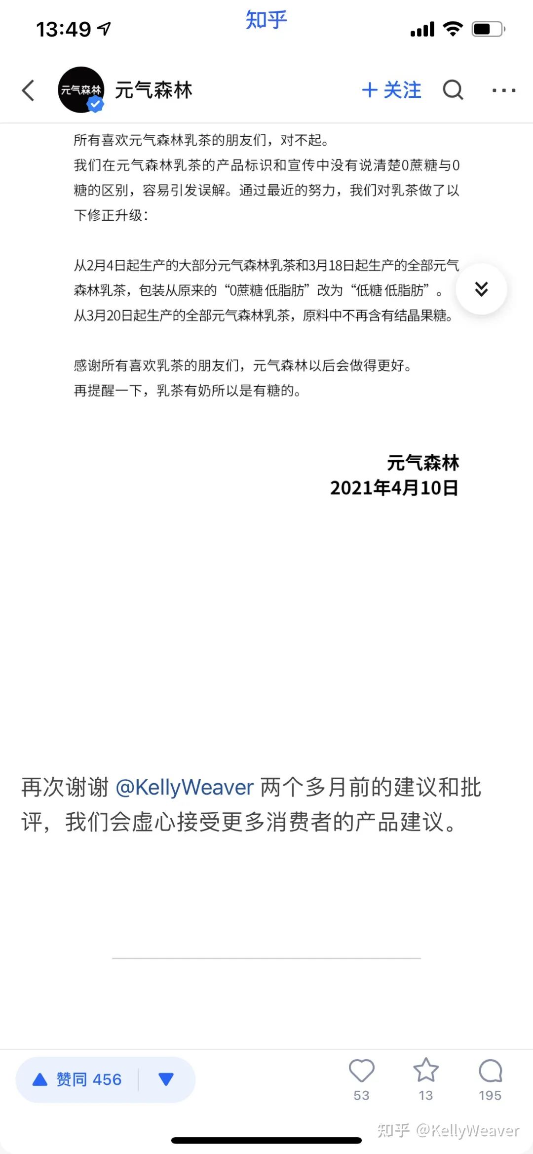 根据我在知乎上的深扒,元气森林这次主动承认错误跟一位知乎认证为公共卫生 / 营养流行病学的大V “Kelly Weaver”有关。