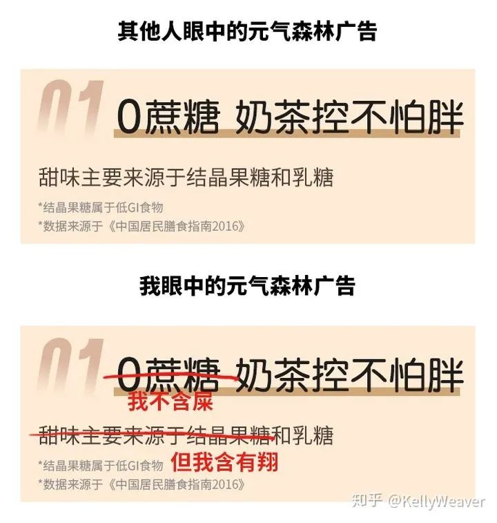 这样看来,元气森林乳茶的“0蔗糖”宣传玩文字游戏的意味十分明显。