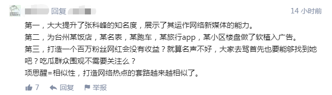 先预设它是一次“突然爆火的营销事件”,那我们接下来需要考虑的就是,有没有既得利益者在背后“推波助澜”?资本家在某些人眼中就有原罪不假,但项思醒本人也是资本的一部分。一个创业者连自己一手捧出来的网红都“安抚”不住把自己闹到派出所,项思醒更是“社死”对象,更别提里面还牵扯一个富二代和他背后的豪门,豪门需要你的这点“破流量”?至于为某饭店、某名表、某跑车、某旅行App、某小区楼盘软植入,这就更吊诡了。这对于张科峰、项思醒、‘富二代,乃至吃瓜群众,所有人都是输家!现在的网络环境不是以前,这种人设和口碑是会被“封杀”的。把三年来自身经历事无巨细描绘成65页的高清PPT,不惜得罪台州大家族也要把自己被“绿”公之于众,占据了这么多的公共资源甚至有可能被追究法律责任?