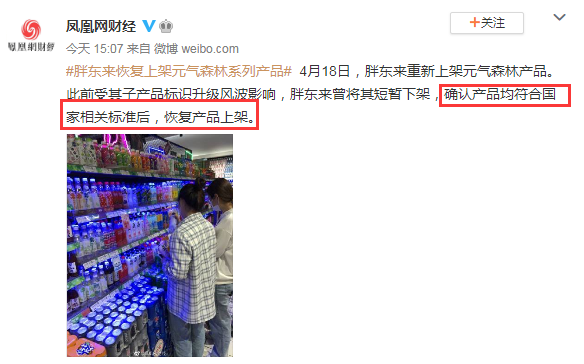 当然,也有部分网友觉得胖东来这是在蹭热度,哗众取宠。不过让人没想到的是,没过两天,4月18号,胖东来就将下架的元气森林又重新上架了。这不是胖东来自己打脸,而是在确认了元气森林产品符合国家标准后,才又重新上架。