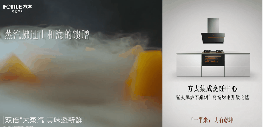 整体来看,这支视频文案充满「意向主义」风格,以鲜明、和高度凝炼的意象生动形象地描绘厨房的方方面面。一顿饭的功夫,仿佛体验了人生百态;一平米的空间,汇聚了星辰大海。火焰有多猛?顷刻点火间,感受撼动宇宙的澎湃动力,体验穿越星河的速度激情。把油烟送到九霄云外,在厨房也能向火山借一股浓岩,向天际借一簇云海,排山布云,一睹自然的壮阔。不得不说方太这个创意太绝了,将厨房比作星辰大海,用一系列类比重构了厨房想象,无形中赋予了厨房诗意,提升了下厨的幸福感。方太还围绕“一平米,大有乾坤”的主题,写了另外几组烟火气的文案,来阐述厨房里的神奇风景,展现一方烟火天地蕴藏的幸福生活。