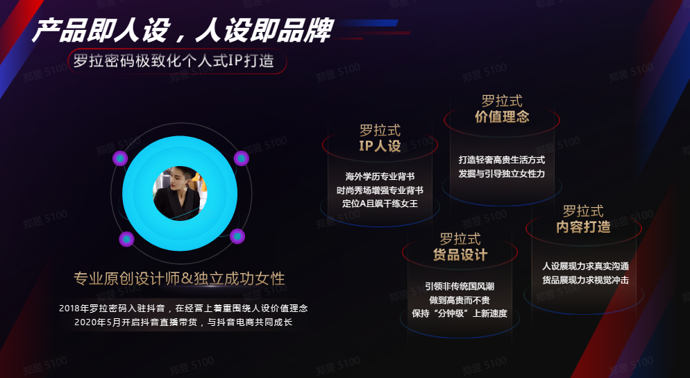 相当一部分女性用户,在睡前都有看手机刷视频的生活习惯,现在渐渐变为睡前看直播的消费习惯。她们通过抖音用自己的方式记录生活,表达自己的态度和主张。也通过直播的方式,实现流量变现。直播电商为品牌主们开辟了一条全新的增长路径,新的消费习惯正在形成。根据毕马威联合阿里研究院此前发布的数据显示,预计2021年直播电商整体规模将接近2万亿元,对品牌而言,这是一个蕴藏巨大潜力的市场,如何在机会消失之前抓住机会红利,打造线上的核心阵地?郑昱认为,本质上抖音是冲动消费的平台,要让消费者从没有购买欲到产生购买欲,从没有需求到有需求的这个变化,抖音上有一个罗拉密码,案例值得参考。“产品即人设,人设即品牌。人设注定了这个路到底能走多远。”