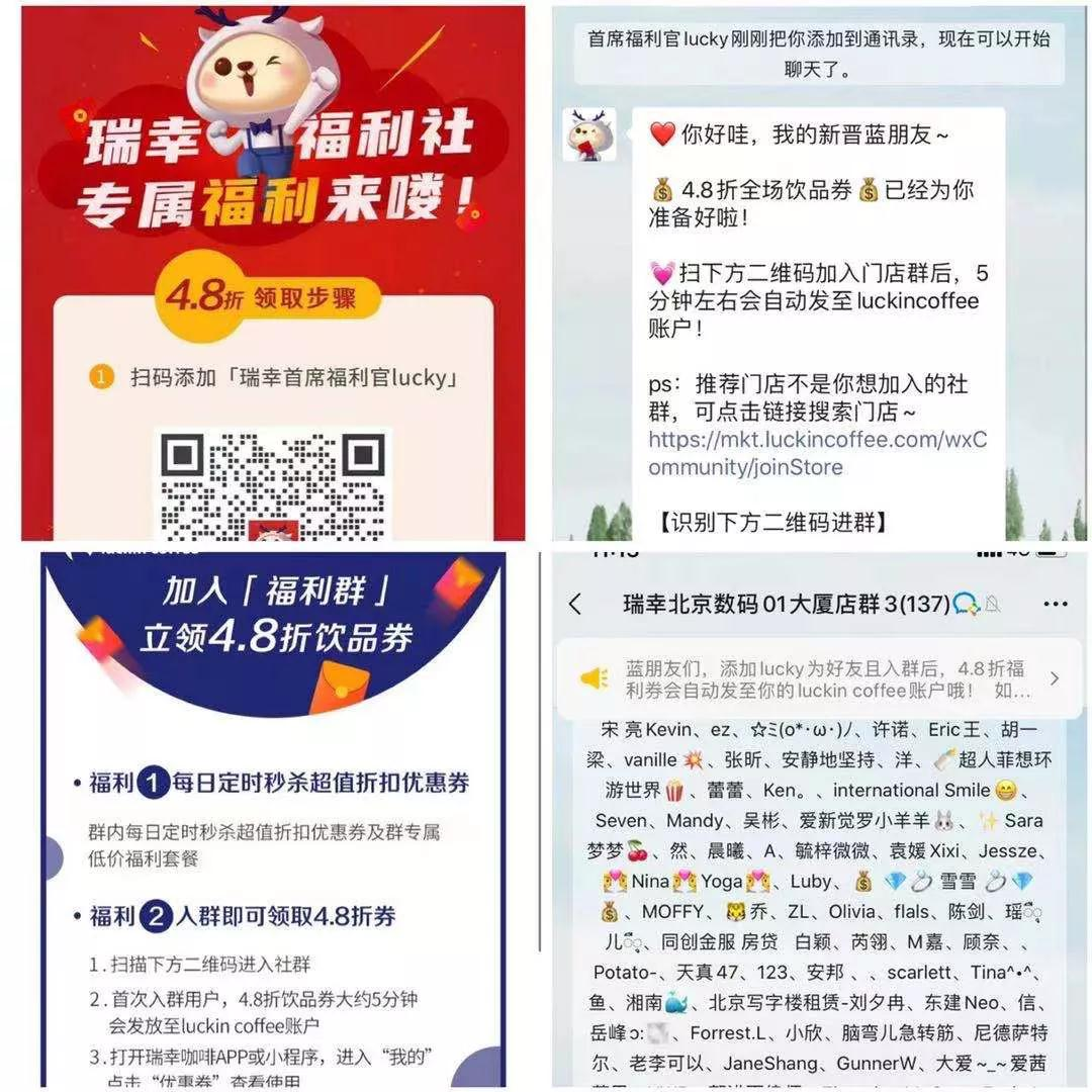瑞幸将前期通过疯狂扩张获得的用户,用优惠券作为入群的吸引点,引流至社群,围绕门店的LBS位置拉群,机器人瑞幸首席福利官每天会在四个不同的时间段“发福利”,推送不同产品的优惠券,以驱动流量进行转化。