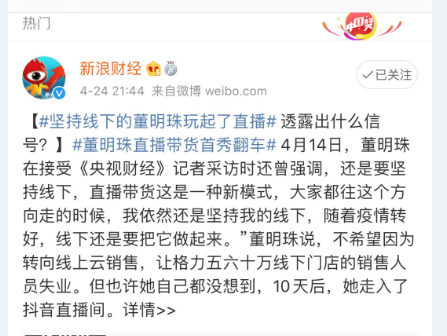 疫情下的家电行业,需要寻找一种新的渠道营销模式,来释放压力。董明珠曾公开称,2020年第一季度损失300亿左右,看来曾经承载百亿级别销售额的空调,在二月和三月几乎颗粒无收。根据此前格力披露的业绩报告显示,预计2020年一季度净利润13.3亿至17.1亿元,同比下降70%至77%。可见,突如其来的疫情,对家电行业的冲击,无一企业能够独善其身。而格力背后,实际上是中国整个家电产业群体发展的共同写照。虽然说,董明珠多次公开表示,不会因损失裁员,这种行为称得上中国好老板,但是毕竟企业也需要活下去,才能护员工周全。而以抖音为代表的短视频平台的出现,为直播带货提供了滋养和成长的土壤,则网红主播的出现,使直播带货具有很强的财富效应。这一点可以从薇娅直播卖货一晚上赚了一套房,李佳琦买入豪宅和明星做邻居,得到佐证。毫无疑问,直播已经成为一种新的营销和销售渠道。显然,要想让格力们赶紧恢复常态,选择直播带货不枉一个大招。不过,不同于罗永浩和薇娅们,格力具有线下庞大的渠道布局,不可能完全抛弃线下,拥抱线上。因此来看,直播应该是家电行业探索渠道营销的一种新模式,和之前的董明珠的店一样,最终的目的必定加速线上线下融合。就像董明珠之前采访所说的,“我在想怎样能带着几万家门店同时去做线上线下融合,形成一个更完美的营销模式”。直播不仅具有财富效应,更是变革了产业链的运行逻辑。直播模式本身具有很强的实时交互属性,因此来看,作为商界领袖,董明珠的直播首秀,实际上也释出一个信号,那就是家电品牌和用户深度交互的尝试。表层上来看,所谓的直播带品牌,就是实现产品和品牌可视化的过程。不过深层来看,这只是直播商业价值的一个缩影。最关键的是,通过直播更好的贴近市场、拥抱用户、洞察趋势,最终完成对企业、用户、生活场景的重新定义。以喜茶、完美日记为代表的新晋网红品牌,都是每天在网上跟消费者接触,沉淀了更多源于用户的意见,这就有了在需求洞察上的话语权。这种对消费者需求的洞察和趋势分析,将反哺于产品供应链端的变革。大家都知道,网红主播之所以敢打低价,就是因为饶过了品牌,直接和生商厂家对接,不管是李子柒,还是薇娅都是这样的套路,甚至有主播直接干起了厂家的生意,自己做起了供应链。实际上,不仅是个人主播,京喜的产业带直播,也是同样的道理,就是直接让消费者和厂家通过直播直接沟通,从而构建高效灵活的供给、需求的精准对接能力。企业创始人直播,正在成为给品牌“立人设”的高效方式,同时也带来全员营销的动员能量!当下,随着直播带货的崛起,购买渠道更加丰富化,而品牌和消费者的关系更加趋向于协作、交互,这意味着品牌必须具有人格魅力,才能容易贴近消费者。品牌本身是抽象的,而建立创始人形象无疑是使抽象转化成具象的一种方式。当下不少科技互联网公司都用创始人为品牌做背书,使品牌更具有人格化,进而使创始人和品牌形象划等号。比如,苹果=乔布斯、小米=雷军、阿里巴巴=马云、京东=刘强东、锤子=罗永浩,格力=董明珠。而且,最重要的是,老板毕竟比一般的红人主播更理解自己公司的核心专长和调度能力,相对来说,更能对自家产品、团队、故事、底蕴进行再创作,从而满足消费者的好奇心与互动问题。从另一个方面来说,CEO具有更强的员工领导力,无论是立人设,还是直播带品牌或带货,不但能起到一定的广告效果,而且具有很强的营销能量,带动起全员参与的积级性。最后用杰夫·贝佐斯的一句名言来结语:公司发展最难的瓶颈部分,要使大家感觉“老板特别给力”。1.李檬:董明珠直货20万,其实是赚到了“2个亿” 2020年4月28日2.家电魂 冯同:董明珠都开始玩直播,对家电行业来说意味着什么?2020年4月29日3.互联网头条,木易:一晚上才赚23万,董明珠直播失意的背后,真正的高手,都懂得放下面子。2020年4月27日