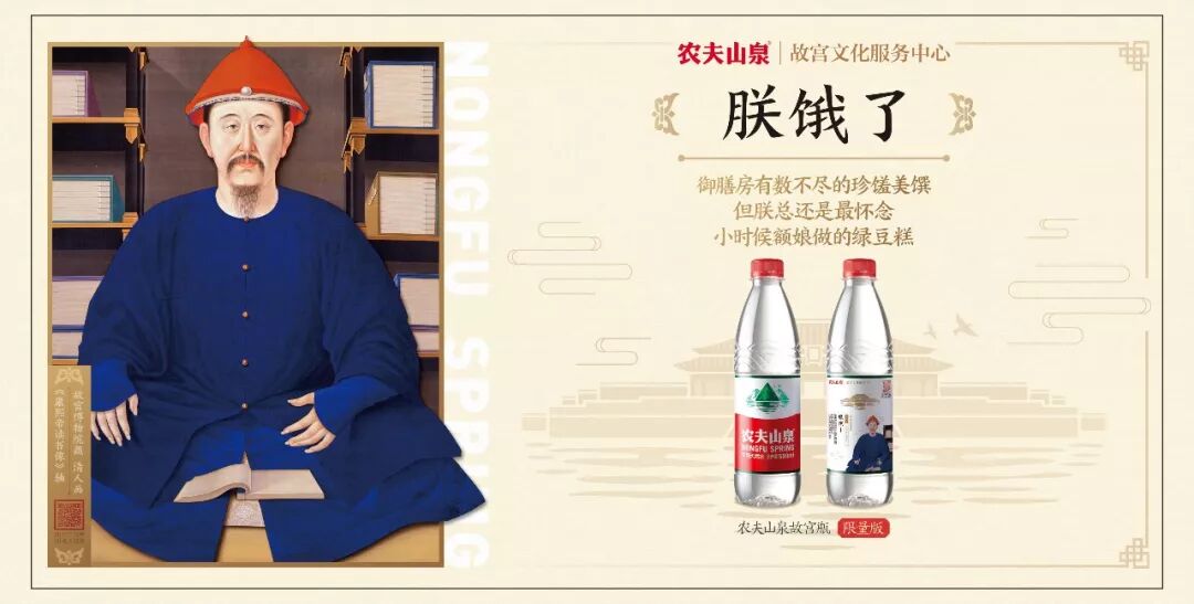 农夫山泉就把故宫这个中华民族图腾发挥极致,推出带有九幅馆藏人物画作的故宫瓶,配合social化的现代解读,简直逼格侧漏,彰显神圣不可侵犯的文化尊严。