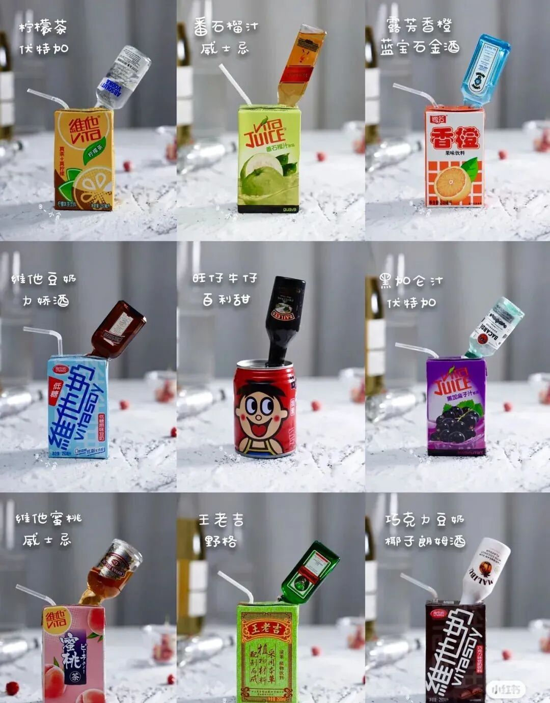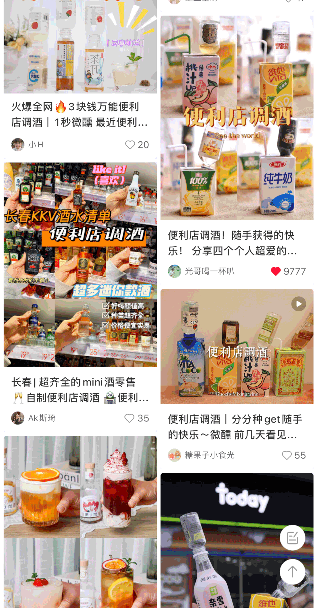 近两年,为了聚焦新生代消费群体,泸州老窖还和星座媒体大咖同道大叔共创星座酒,将产品年轻化。在《三生三世十里桃花》热播后,泸州老窖又推出“桃花醉”蹭流量,甚至还跨界定制了香水2.0版“顽味”搭配销售。不仅在产品上年轻化,为了让品牌也更加年轻化,增加自身品牌在年轻群体中的影响力,泸州老窖还跨界推出了断片雪糕、酒心巧克力、酒糟醒肤修护面膜等诸多非酒类产品。泸州老窖甚至还通过打造品牌IP形象窖小二不二,在抖音、B站、微博等平台上线,以严谨科普、趣味讲述的内容方式帮助泸州老窖快速破圈,希望能将产品在年轻人群体间种草。可在酒水这个并不那么年轻的赛道里,不论是各个新品类一波接一波的产品,白酒、啤酒、果酒轮番上阵,还是像泸州老窖这样内容营销的不断推陈出新,线上线下各个渠道全部轰炸。如今都难现第二个江小白的传奇,现在就连江小白也自身难保,在年轻人市场中不断寻找新方向。品牌们面对潮流多变的年轻人和数不胜数的竞争对手,用尽所有力气却难达成效,不得不叹一句,日日思君不见君,你在喝啥品牌酒?从前两个月火遍全网的便利店调酒,我们也许能找到些许答案。一盒软饮,在吸管旁边的位置先挖一个圆形开口,插入吸管喝几口后,再将迷你瓶装基酒倒立插入饮料中,一杯简单的便利店特调鸡尾酒就完成了。打开小红书、抖音、微博等社交媒体搜索“便利店调酒”,就会发现各种花样百出的便利店调酒攻略。柠檬茶+朗姆酒=Mojito,微醺刚刚好,加上冰块和气泡水,一秒入夏。这是其中一份特调攻略。无论是多普通的基酒,都可以搭配上各种猎奇的饮料,就算不那么好喝,这酒依旧能讨得年轻人的喜欢。你以为他们喝的是酒,其实他们喝的是潮流;你以为他们喝的是口味,其实他们喝的是心情。