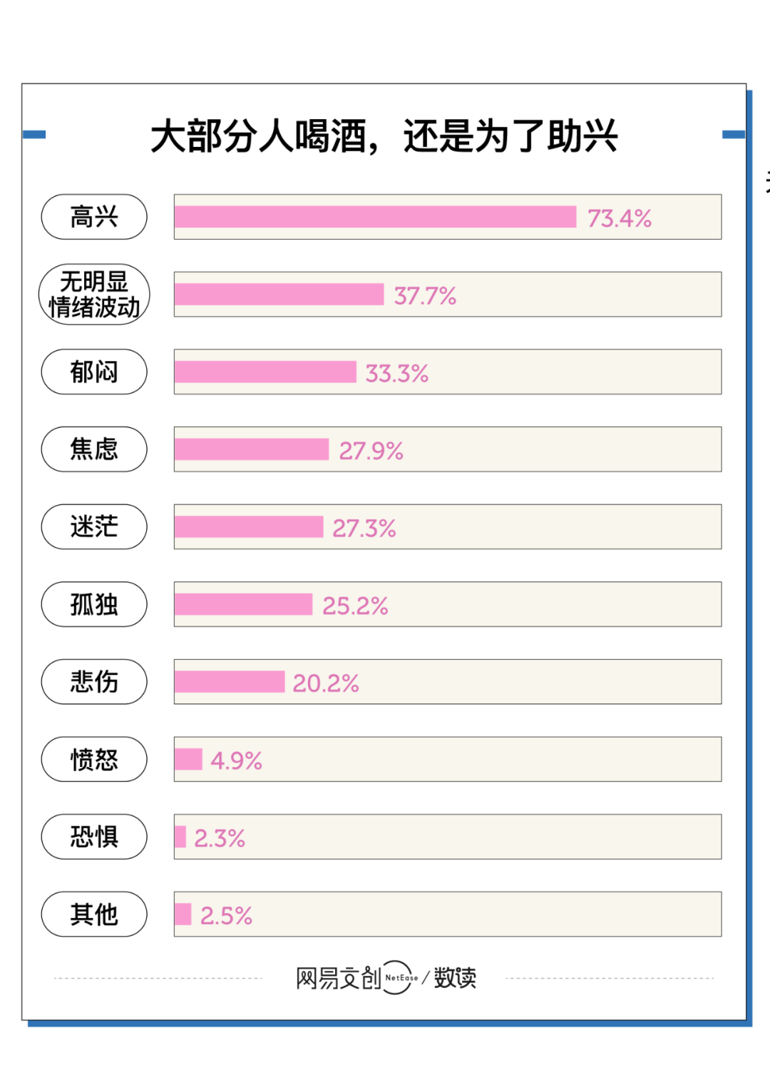 网易在《当代年轻人轻饮酒调查报告》中这样说到,如今的年轻人,正在把酒放回它的本位,轻饮酒成为他们中的流行风尚。比起大醉,轻饮酒的可控、随性与情调,更让人舒适和快乐。在饮酒理由的调查中显示,有超过七成的人喜欢在高兴的时候来一杯,当然也有三分之一的人借酒消愁。