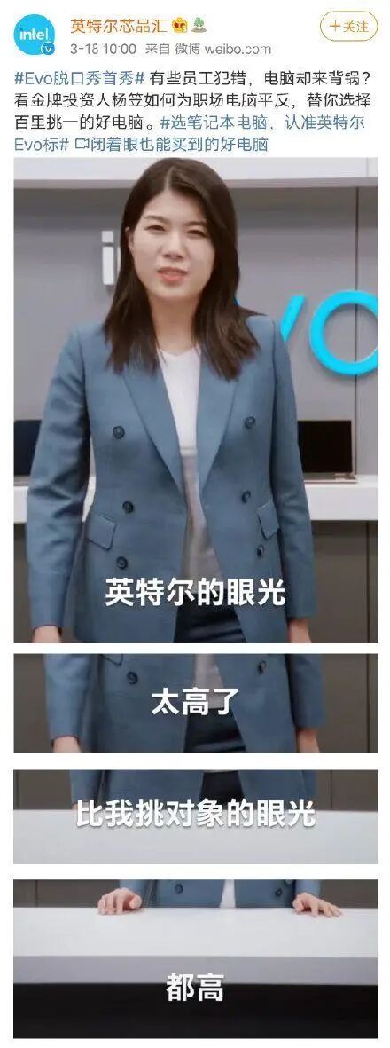 而杨笠与英特尔的翻车更在于此,杨笠本是男女对立话题的敏感人物,代言文案依然还是自己脱口秀中惯用的话术:英特尔的眼光太高了,比我挑对象的眼光都高。