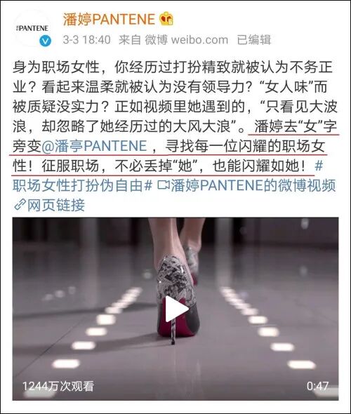 而潘婷也因对女性的刻板印象翻过车。今年妇女节期间,潘婷通过一支创意广告讽刺了当下社会对于职场女性的刻板印象和偏见。但它的微博文案:“潘婷去‘女’字旁变潘亭,寻找每一位闪耀的职场女性!征服职场,不必丢掉‘她’,也能闪耀如她!”却意外翻车。