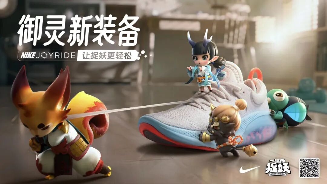 在影片中,跑步时出现专属的红、蓝缓震颗粒元素构成的梦幻光带特效,是本次联动专属的御灵装扮套装特效,该套装还能帮助各位玩家在游戏里跑得更轻松。在游戏里捉妖本身就是一件很有乐趣的事,尤其是速度提升20%之后,看着NIKE跑鞋的梦幻光带特效,休闲行走的乐趣体验起来就非常有意思了。王晓奇特别强调,这一次合作的还是NIKE旗舰级跑鞋JOYRIDE,那可是NIKE,还是旗舰啊。经过一番严肃的讨论后,王晓奇觉得这双跑鞋出场的时候必须要隆重,规模必须要跟发布会看齐,最起码摄影师肯定是不能少的。于是,就有了下面这一幕: