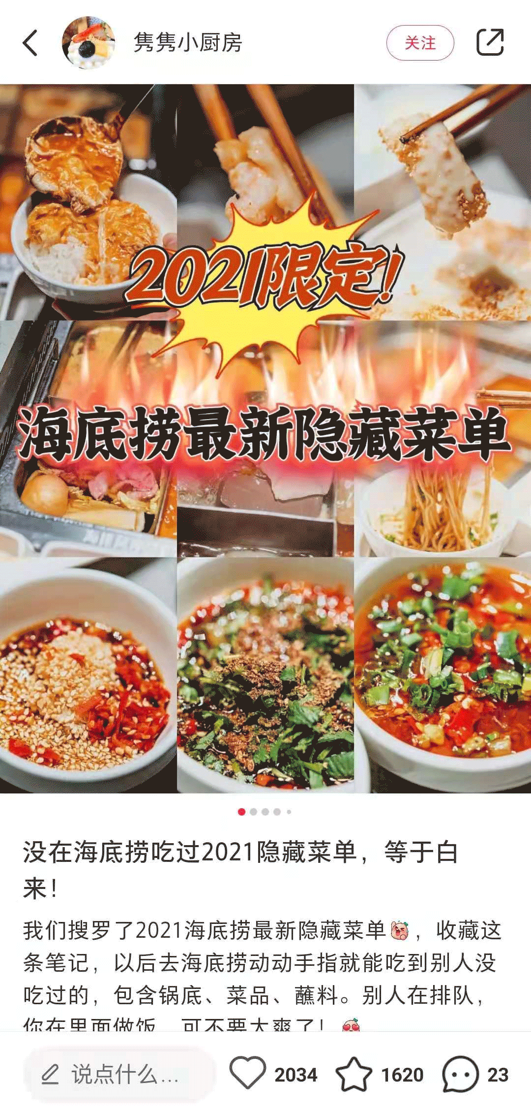 值得注意的是,一些博主或者网友,还会用一些或惊艳、或夸张的标题,抓你的眼球,让你看了欲罢不能,很想马上冲进门店体验一把。比如小红书上各种攻略标题就很吸睛,既有“超全热门奶茶隐藏点单攻略”、“保姆级奶茶点单攻略”;也有“史上最吸睛高街版星巴克隐藏菜单”、“人气top的3种喜茶隐藏菜单”,还有“好喝到哭”、“没在海底捞吃过2021隐藏菜单等于白来”........细节之处充斥着凡尔赛的高级味道,好比在告诉你“这个秘密一般人我不会告诉他”。社交平台的美食博主们,只为用华丽的文字,给你打包票,每一款隐藏菜单都是亲测之后的良心出品,跟着点绝对不会踩雷入坑。