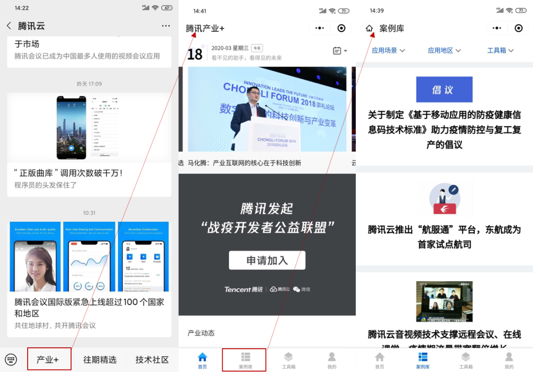大型ToB企业都有公众号,将“数字化品牌展厅”小程序置于公众号菜单栏,如腾讯云公众号-产业+,微信支付商户通公众号-智慧趋势这两个小程序比较有代表性: