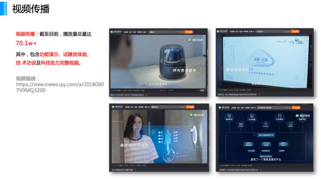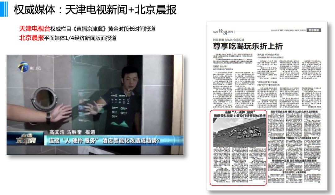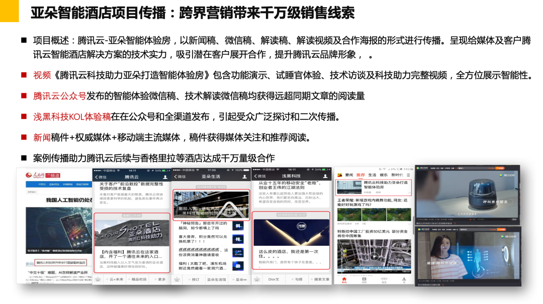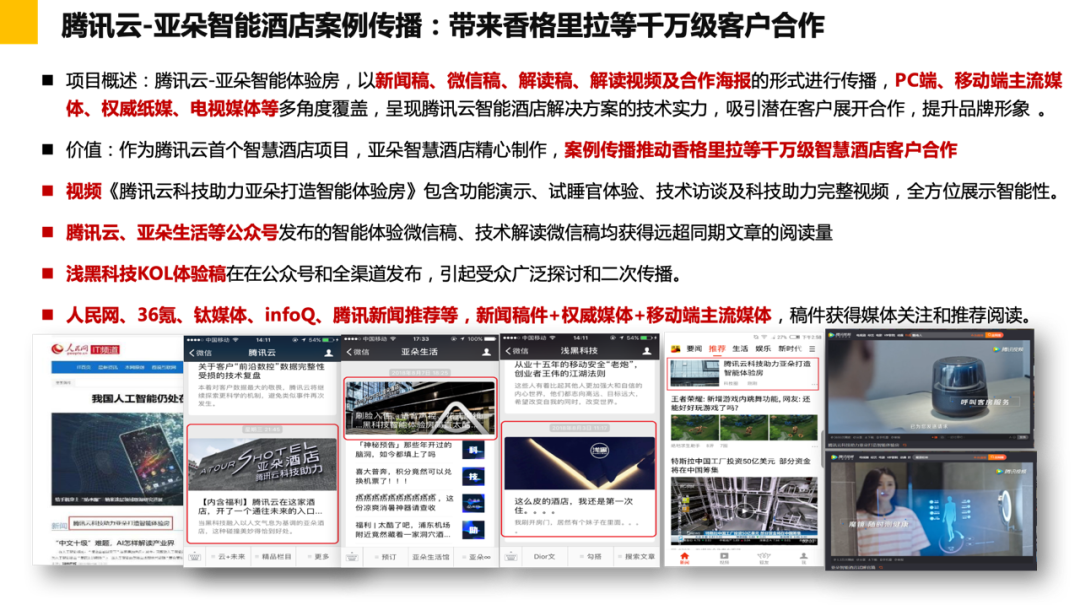 项目概述:腾讯云-亚朵智能体验房,以新闻稿、微信稿、解读稿、解读视频及合作海报的形式进行传播,PC端、移动端主流媒体、权威纸媒、电视媒体等多角度覆盖,呈现腾讯云智能酒店解决方案的技术实力,吸引潜在客户展开合作,提升品牌形象 。