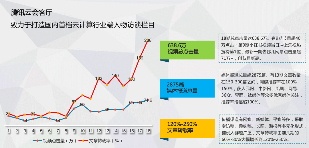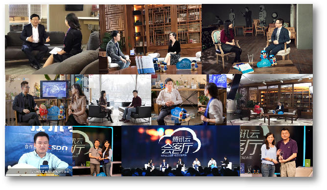 腾讯云采用的方法是腾讯云副总裁曾佳欣对话客户高层(CTO为主),做成了一档视频栏目——腾讯云会客厅,在探讨云计算话题时巧妙带出腾讯云对客户企业发展的价值,在多个视频平台进行传播,配合媒体报道,视频传播效果非常不错,从16年一直持续到现在。