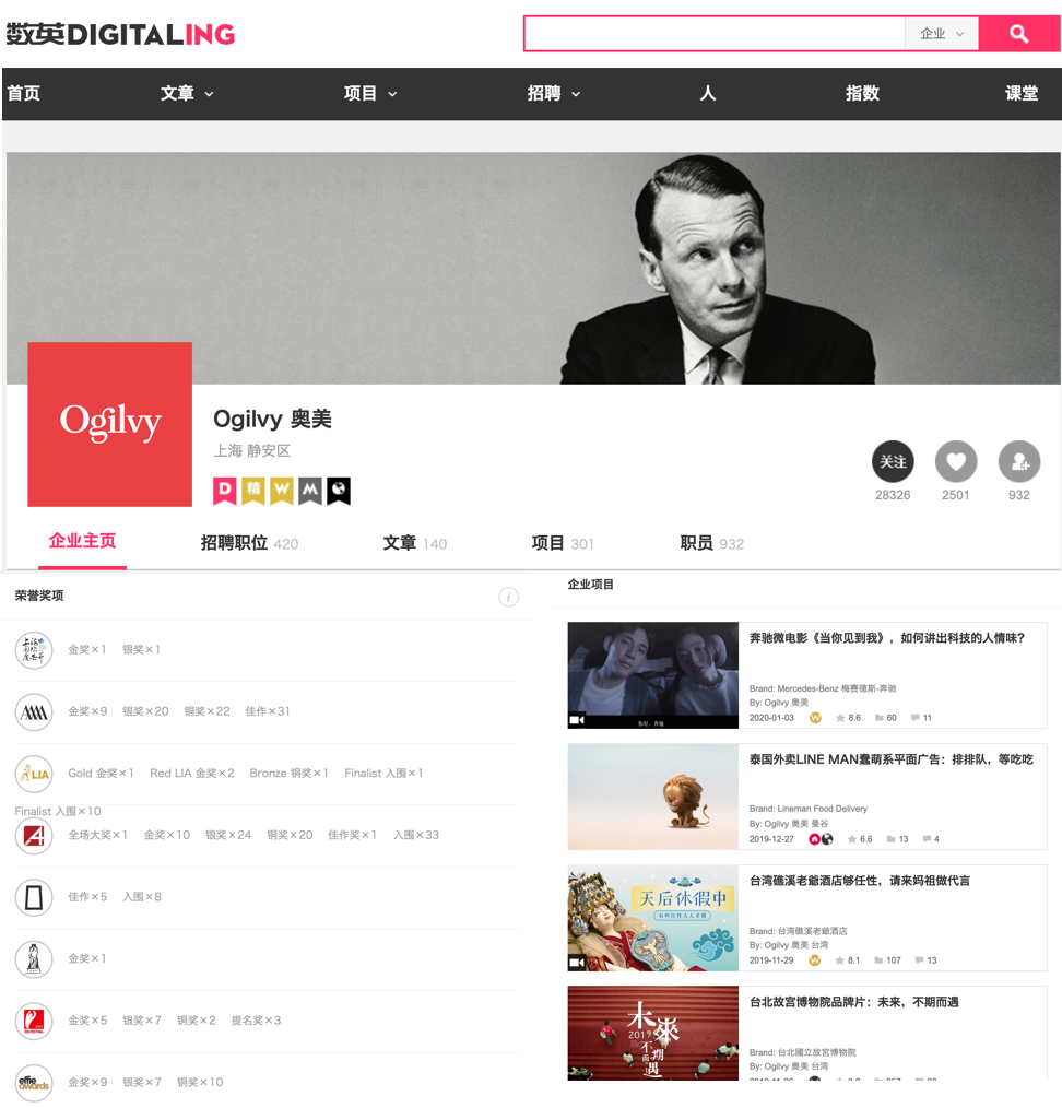 在目标企业客户决策人可能会经常光顾的行业网站上,精心展现企业案例,也是个不错的方法,下面以奥美在广告行业网站-数英网上的展示为例。