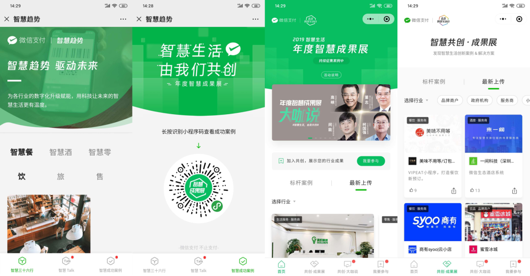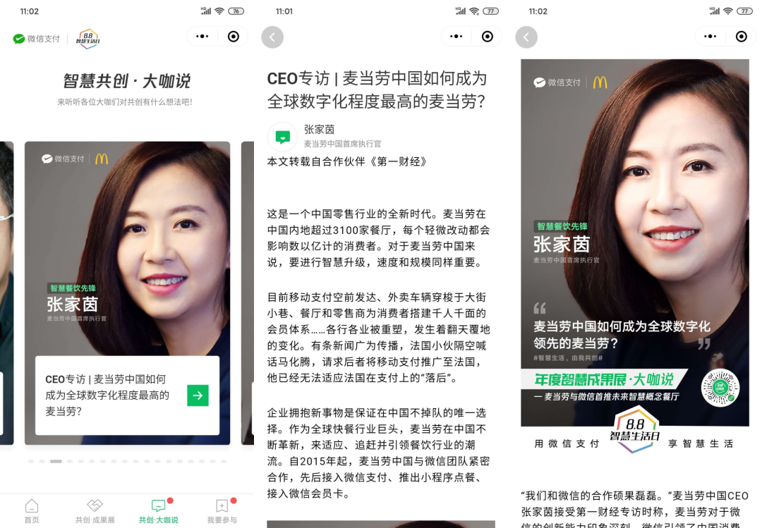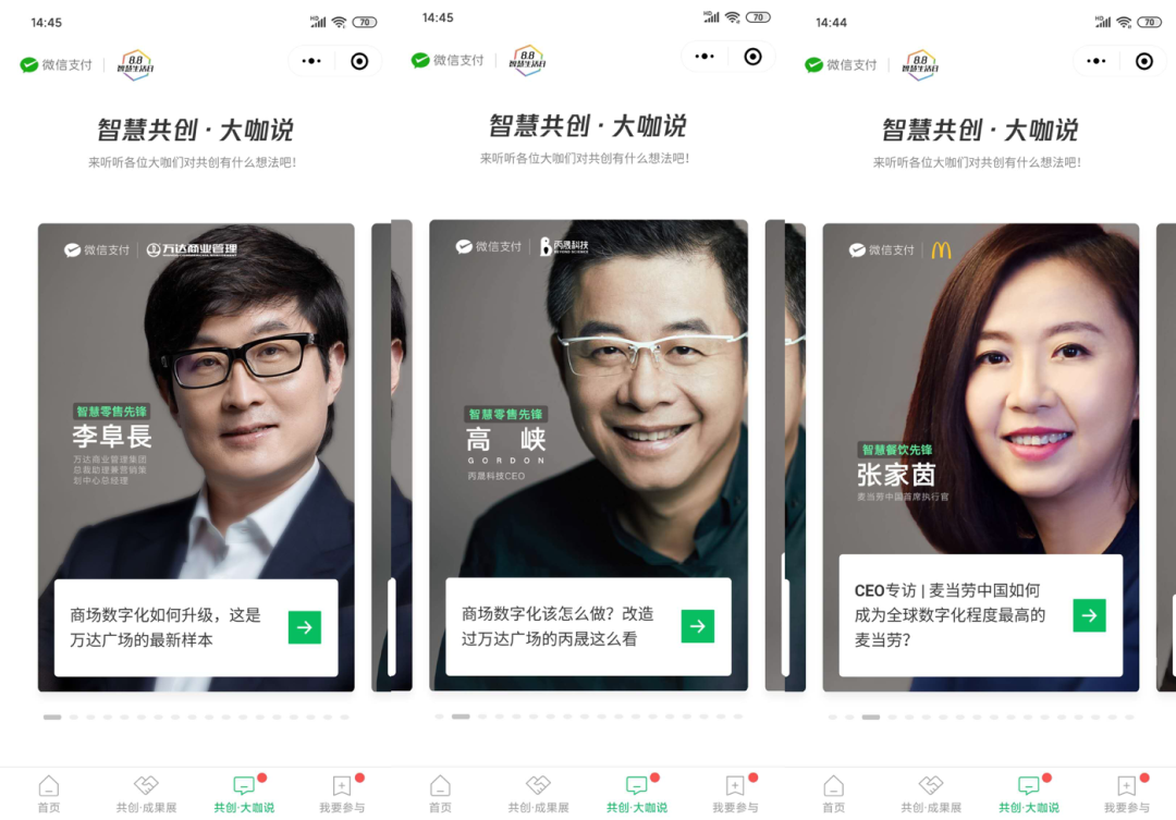 微信支付ToB端将这一形式称之为“智慧Talk”,具体来说,先用第三方媒体对大客户高层进行专访,形成报道文章,然后制作精美海报,形成“大咖说”系列,集合在“智慧生活成果展”这个小程序里。