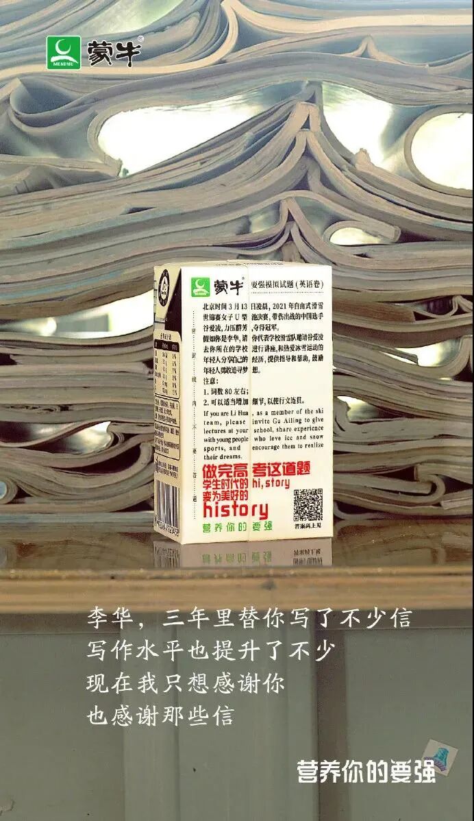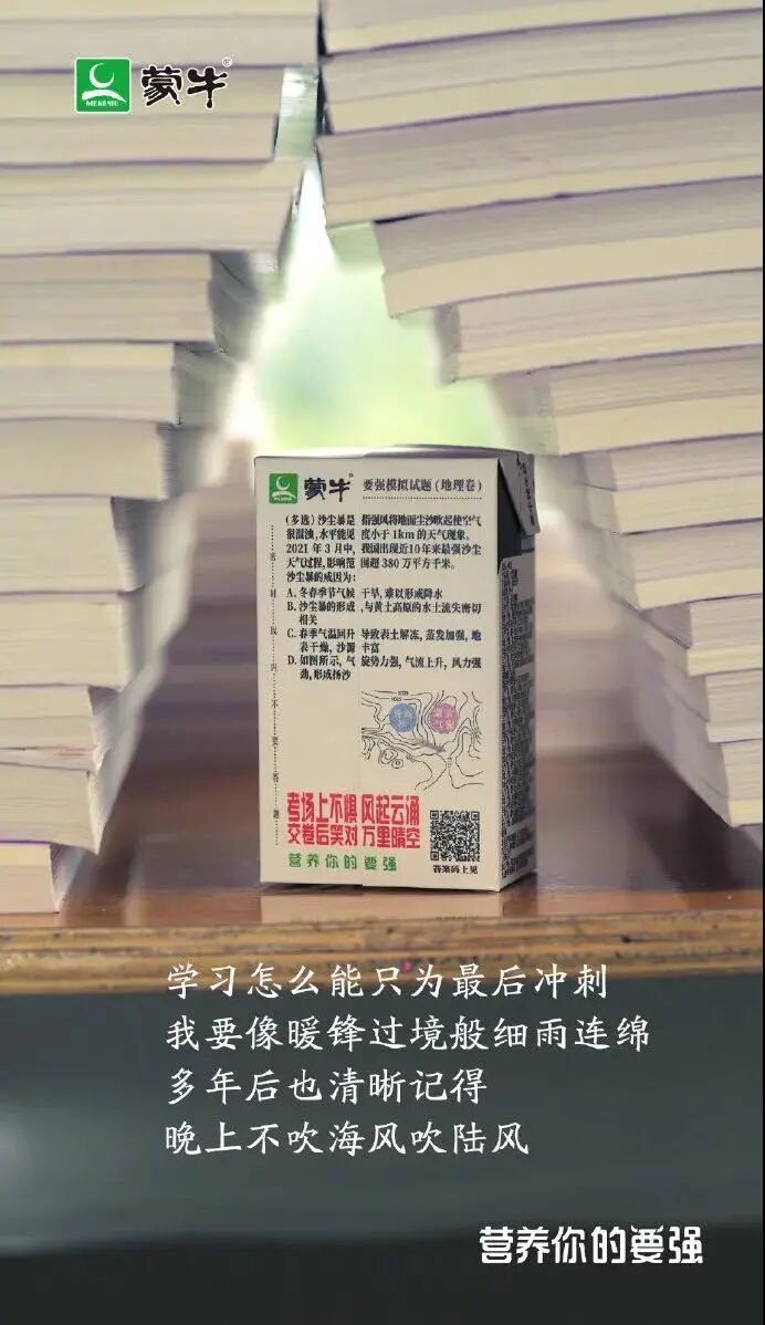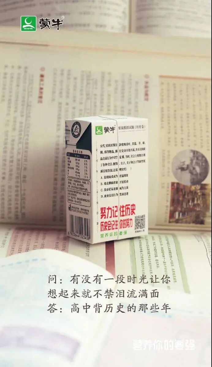 作为最后的冲刺,“押题”自然是高分的捷径。蒙牛聚焦考生们的心理诉求,邀请各科专业老师出题,最终将 8 道题目印在牛奶盒上,这种方式既能帮助考生巩固知识点,又能减少考前的焦虑,还能传递品牌「营养你的要强」核心利益点,可谓一举多得。