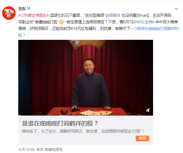 于是,京东顺势发布了一支《让热爱金榜题名》广告片,“进攻型捧哏”阎鹤祥主演,搭档丢了,为了生计,阎鹤祥写网文、做生意,没成想居然被现实“打脸”!