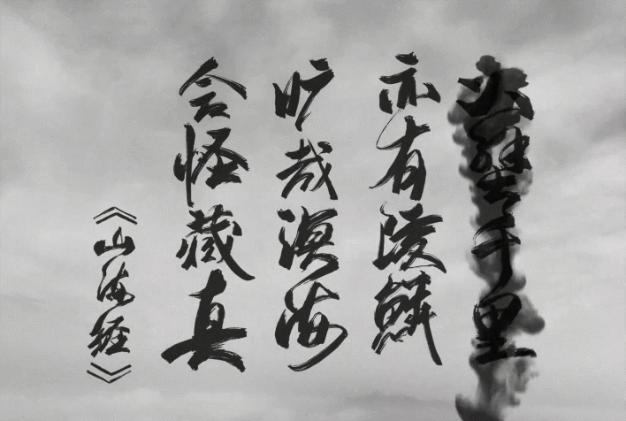 比如在短片的开头,先是出现了一副书法作品,内容出自《山海经》:大蟹千里,亦有陵鳞;旷哉溟海,含怪藏真。然后所有的字,逐渐从纸上飞了出来,凝成几团向四周冲去,忽然镜头一转,画面又来到了一个湖上。