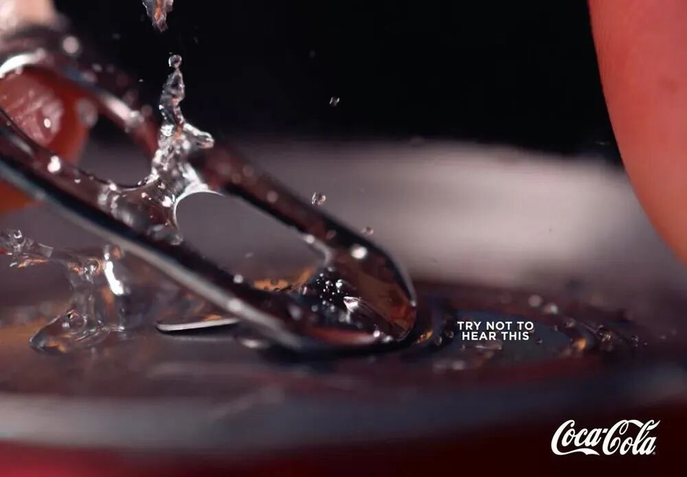 通过调动消费者的五感、打造出沉浸式场景体验的,还有可口可乐2019年戛纳平面类金狮作品“Try Not To Hear This (试试别听这声音)”。海报运用通感的写法,让消费者在画面之外,听到了拉环被拉起、玻璃瓶盖被撬开的声音,联想起夏日时大口大口畅饮冰可乐的快感。