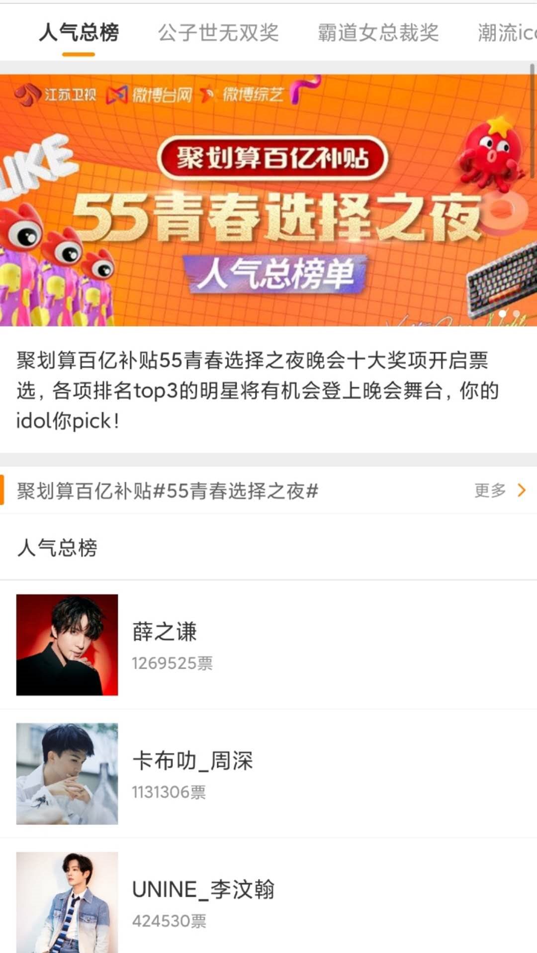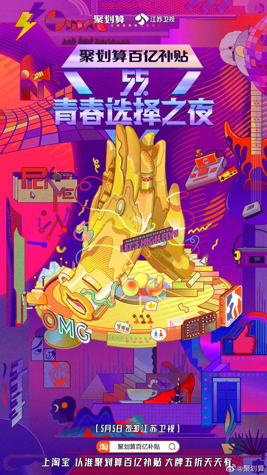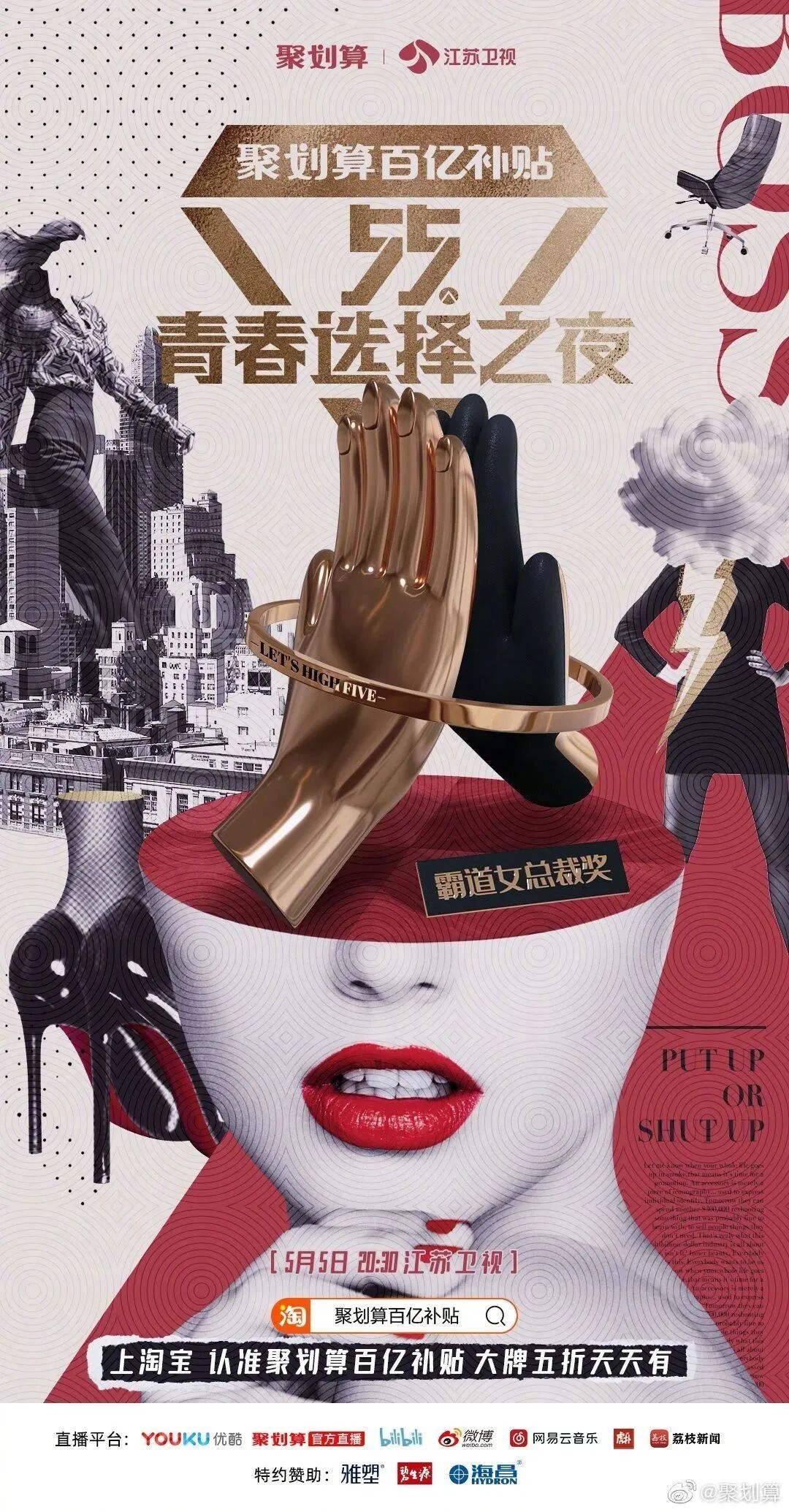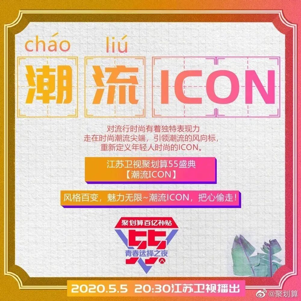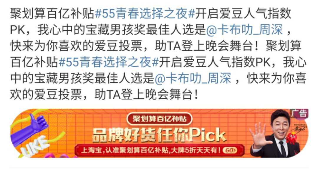 视频中的“5、5、5”可谓相当魔性,在略带洗脑的重复中,强化了聚划算商品5月5日打“5折”的卖点,给观众留下深刻印象。此外,聚划算还发布了一组据说“隐藏55个网络热梗”的悬念海报,粉丝可根据画面中的提示猜测哪些明星将出席晚会。如“OMG”大概暗指李佳琦,而“嘻唰唰”则让人联想到大老师,猜测的过程充满趣味性。除了主海报外,品牌方还延展出了10张包含当下热词、流行文化的系列海报,分别代表不同的奖项和获奖嘉宾。在突出“let’ s high five”这一大主题的同时,每张海报也是各含亮点。如霸道女总裁奖,画面中出现了高跟鞋、老板椅以及雷厉风行的新时代女性形象,不禁让人猜想,这是刘涛、韩雪?还是谁?而聚划算官方对这10大奖项的解读,也满满都是当下年轻人喜欢的热门梗,值得一品!“55青春选择之夜”可谓是大牌云集星光熠熠,吸引了大批明星粉丝。因此聚划算还联合微博、网易云音乐、Bilibili、虎扑4大网站,开启人气票选大赏,邀请用户为自家爱豆投票助力。各榜排名TOP3的明星将有机会登上晚会舞台,投票与奖项挂钩的活动机制设置,让此次活动带着强烈的明星pk意味。基于此,粉丝们为了让爱豆登上晚会并夺取奖项C位,也是使出浑身解数。活跃的“死忠粉”们不仅自己积极投票,主动承担起打榜职责,还自制了详尽的投票攻略,号召其他粉丝加入打call行列!明星自带的话题度加上粉丝效应,无疑为晚会传播加持不少光环。此外,粉丝投票后分享的微博下方还自带“聚划算百亿补贴”广告,点击一下可直接跳转到淘宝专页。对于聚划算来说,用户的每一次参与都是一次品牌曝光与销售引流。可以看出,聚划算为了预热“55青春选择之夜”,可谓是下了不少功夫。无论是概念宣传片还是悬念海报,都融入了不少年轻人偏好的流行元素,不仅极大地吸引了受众的观看兴趣,也更容易赢得他们的喜爱,达到良好的传播目的。聚划算“55青春选择之夜”这波预热,你觉得咋样?晚会你会观看吗?