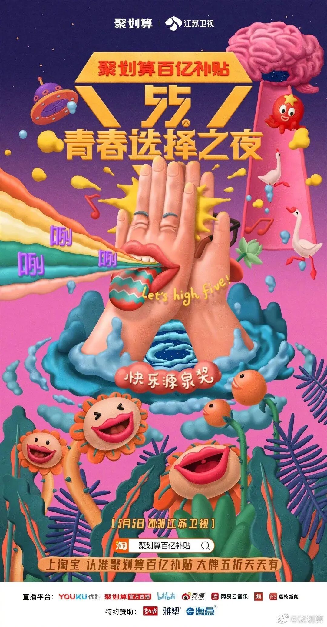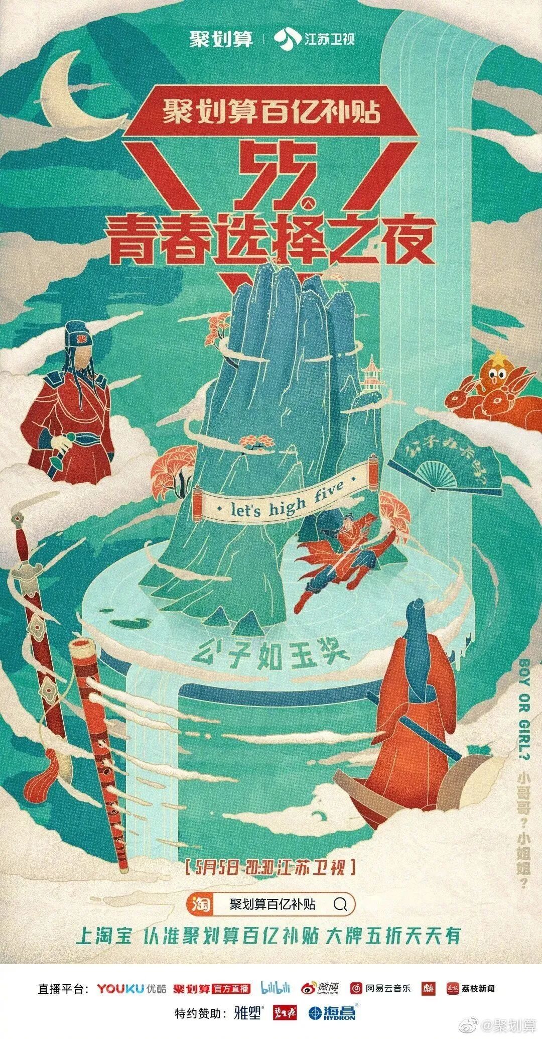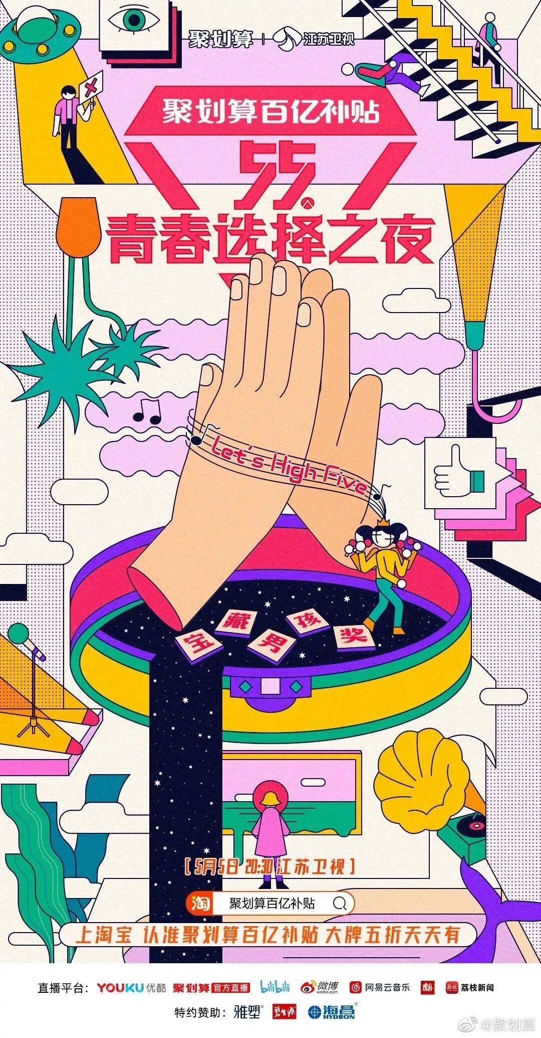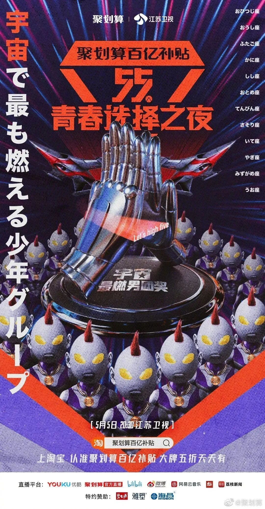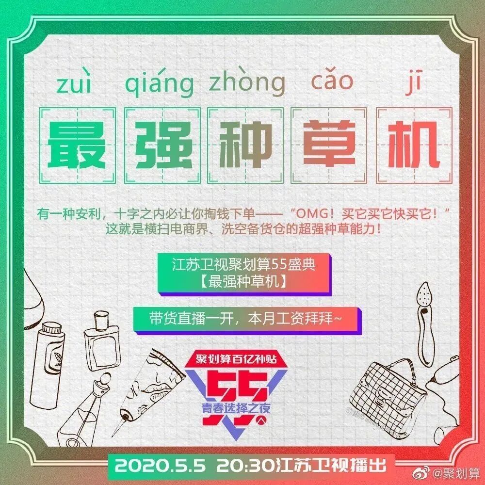 而今年5月5日,阿里旗下的聚划算也将联合江苏卫视,举办这样一场主打“买买买”的晚会——“55青春选择之夜”。从名字就可以看出,聚划算在试图打造一个专属于年轻人的狂欢盛会。