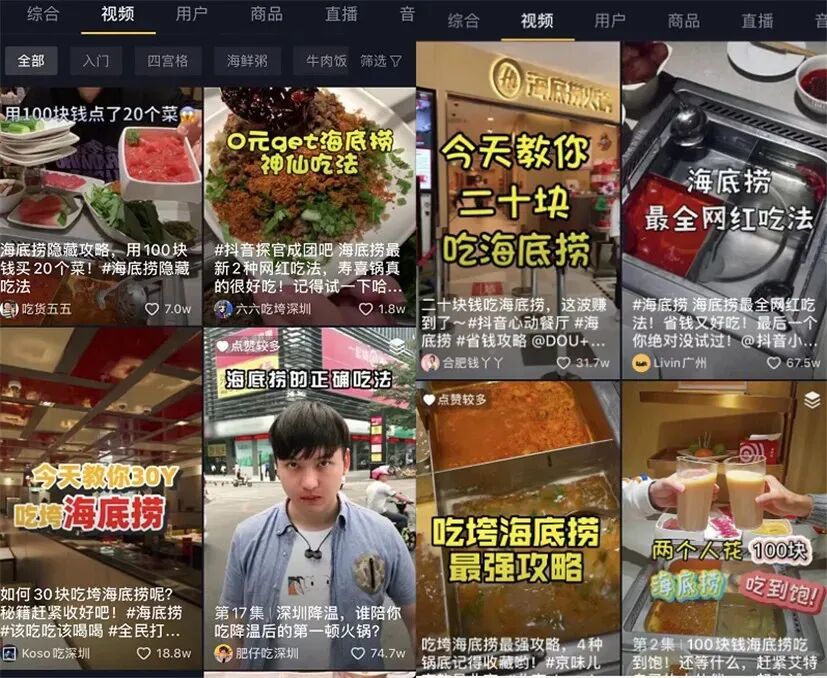 首先,海底捞在“吃垮海底捞”这件事上是受害者角色,更多网友对这种换掉牛肉粒的行为表示理解,海底捞的品牌形象并未受损,反而因弱者形象受到额外支持。其次,许多网友为了印证牛肉粒是否还在,特地去打卡求证。由此产生了大量到店量客流,其中包括美食圈有影响力的KOL。最后,说到底这只是海底捞一味调料的改变,小到再也不能再小,竟然在网络引起如此轩然大波,海底捞的宣传收益可想而知。对所有“XX吃垮海底捞”的内容分析可知,无论是图文还是视频,都有非常明显的UGC特征。即使海底捞不主动引导,网友遇到这类话题都会迅速跟进,尤其是网红KOL更不想在内容方面缺席。我们说的这类网友,他们有一个专门的定义叫“薅播”。薅播们往往活跃于抖音快手和小红书,以“我教你省钱”吸引了大量粉丝,为粉丝分享/亲身体验等各种省钱攻略。薅播的前身大家并不陌生,在PC时代他们被称为“羊毛党”,主要抢大众点评霸王餐、某宝上购买优惠券、积分兑换等,如今移动互联网时代的薅播,举着手机活跃在海底捞、星巴克、宜家等场所,通过短视频展示薅羊毛过程。假如没有薅播的加入,对于普通的餐馆来说,为了宣传自家店,店主往往会会请亲朋好友进店体验,替餐馆发帖宣传。高阶一些的店家会邀请网友到店体验,传播效果是体验者数量的叠加。然而效果没法跟薅播相提并论。海底捞很早就发现了薅播群体的存在,将其收编至品牌的传播体系之中。从第一个薅播到店之后,传播裂变就此开启。时至今日,没有薅过海底捞的薅客都不好意思跟人打招呼。由于吃喝玩乐不分家,这一话题从薅播界破圈到了吃播界,实现对吃货网友的无死角覆盖。