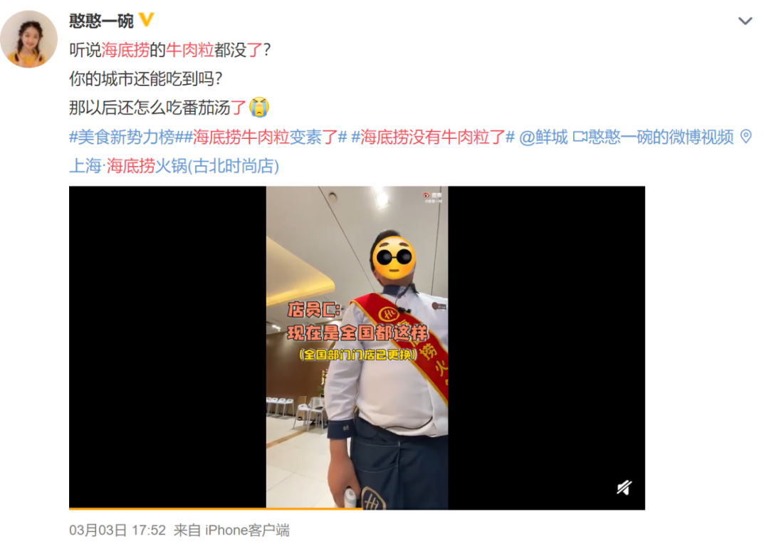 此类内容的爆红并非偶然,其具备了社交媒体传播的“围观”和“争论”两大要素。因为八卦心理,人类天然对负面事件感兴趣,这种挑战规则的行为能够激发人们的好奇心,因此能够迅速引发网友围观。由于挑战行为本身触及道德规范,很容易激发围观人们的正义感,支持者和反对者之间的争论迅速激化冲突,将话题炒热。评估其内容,这类视频对品牌并无伤害,反而能够对海底捞的食材、服务态度进行展现,这类短视频在传播过程中就完成了对消费者的种草。因此,海底捞对这类行为乐见其成。热度拉满之后,海底捞与网友开始一场关于概率的博弈。海底捞押的是,大部分人不会去模仿这种挑战行为。小部分人付诸实践,热门话题产生的广告效果不仅可以覆盖损失,其产生的广告效应更为巨大,正所谓小赔大赚。即使采取模仿行动的网友占比很大,海底捞也并不紧张。前段时间#海底捞没有牛肉粒了#的话题在微博、抖音、小红书热议。海底捞排山倒海的非议,比之前涨价风波有过之而不及。牛肉粒更换的原因扑朔迷离,人们大多相信是因为“X元吃海底捞”行动。比如在一个“海底捞史上最强省钱攻略”的帖子里,网友只用小料,就能自制海鲜锅底、番茄锅、辣锅,再专门调制几款不同的蘸料,其中每项都离不开牛肉粒。