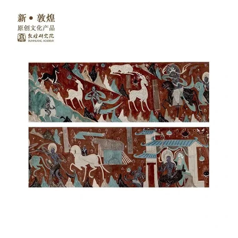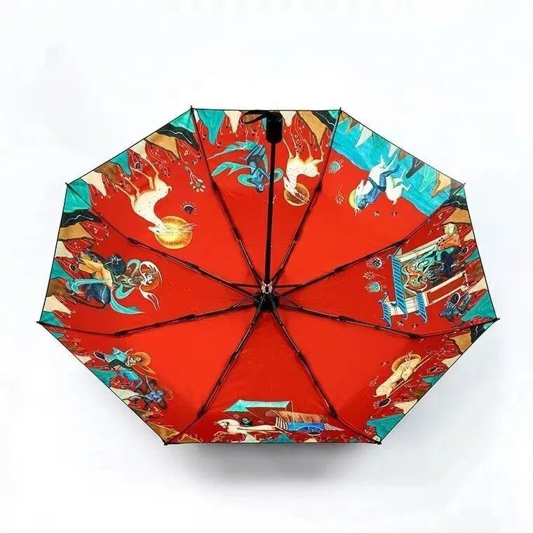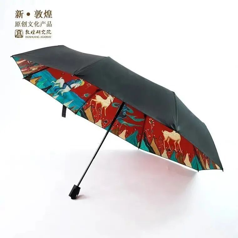 这是一把有故事的伞,伞面还原了敦煌壁画中九色鹿王惩恶扬善的佛经故事。图案颜色则明亮夺目,十分年轻讨喜。