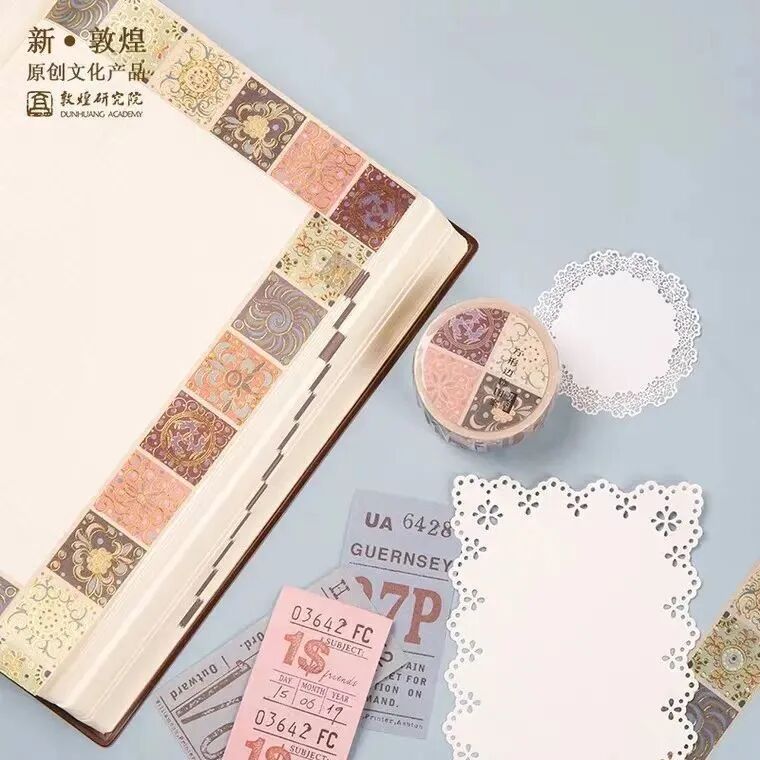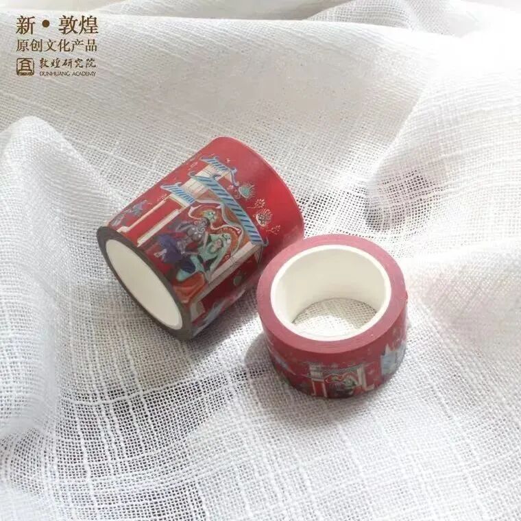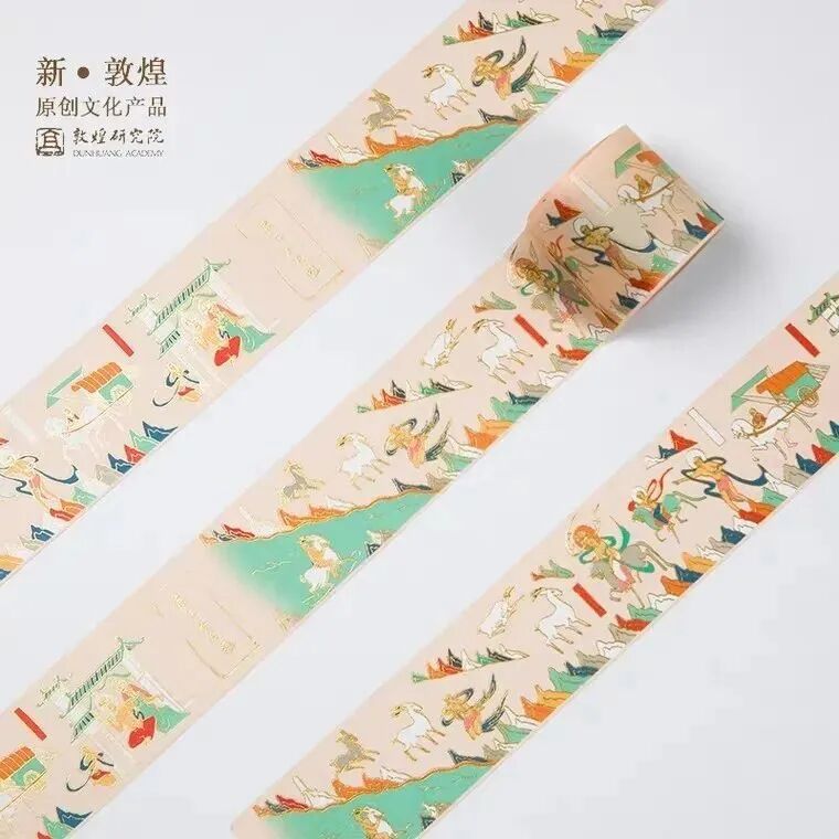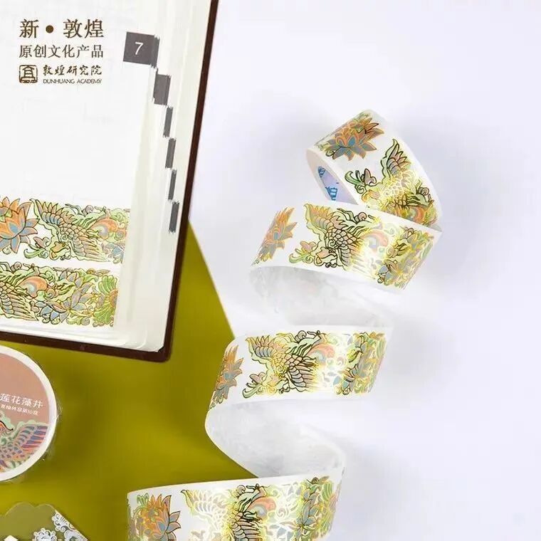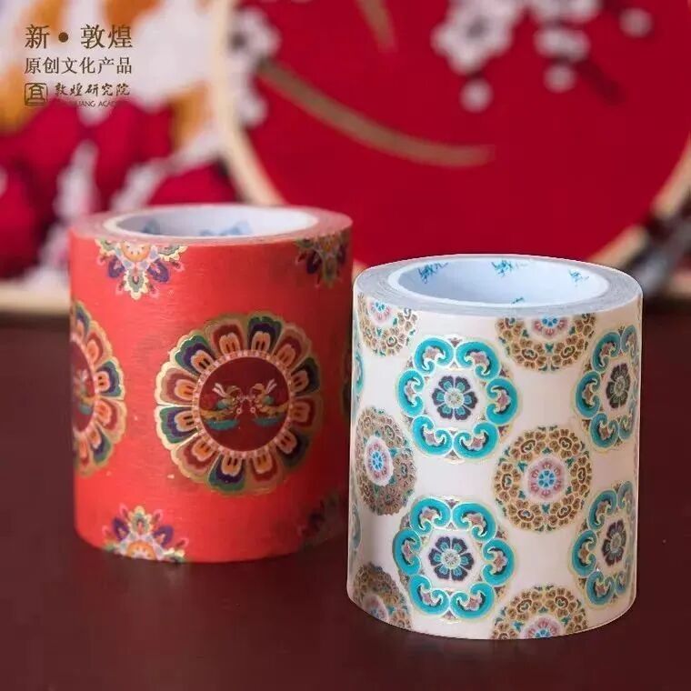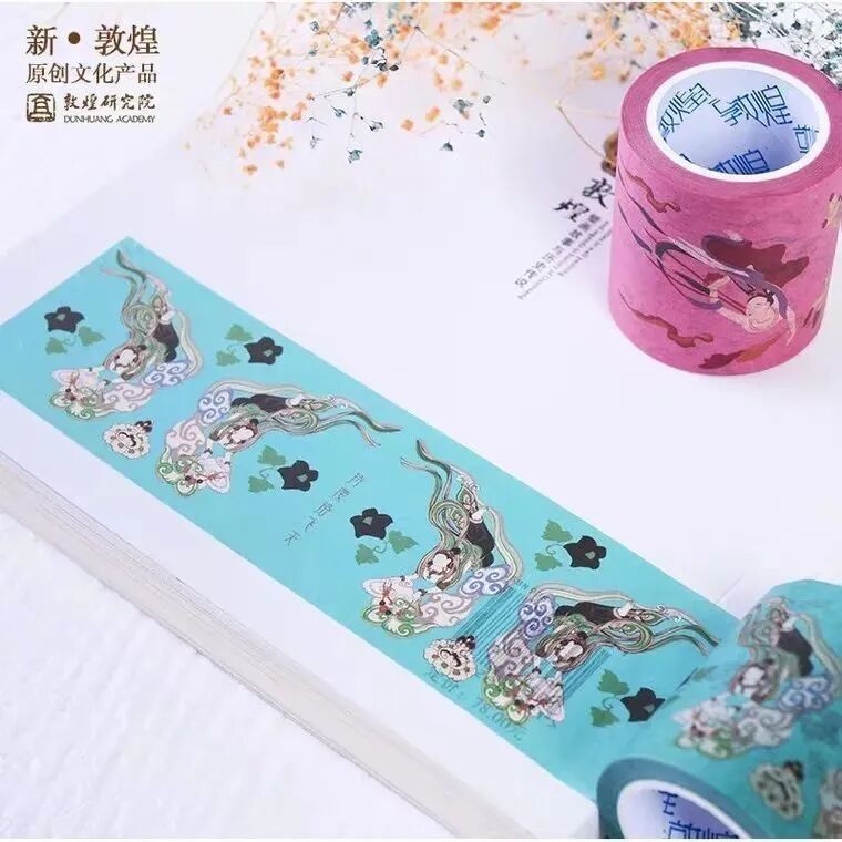 胶带各类纹案、颜色、尺寸,应有尽有,任君挑选。胶带上的九色鹿、青鸾、乐器、花卉等元素,蕴含了浓浓的敦煌文化气息。