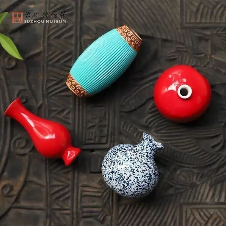 苏州博物馆“陶冶之珍”展厅,有一组风格迥异的颜色釉瓷器。由于广受欢迎,它们被copy成了冰箱贴。当然了,当它们插上花草变成迷你花瓶时,也别有一番韵味。