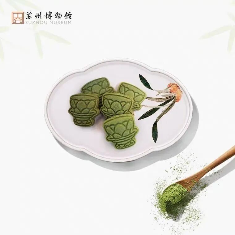 「秘色瓷莲花碗」是苏州博物馆著名的镇馆之宝之一,苏博文创以其为原型设计了一系列衍生品,其中就包括秘色瓷莲花碗抹茶曲奇。一口一口吃掉“镇馆之宝”,这感觉想想就好奇妙。