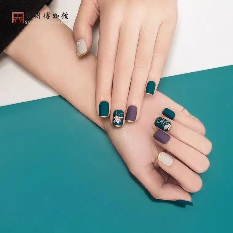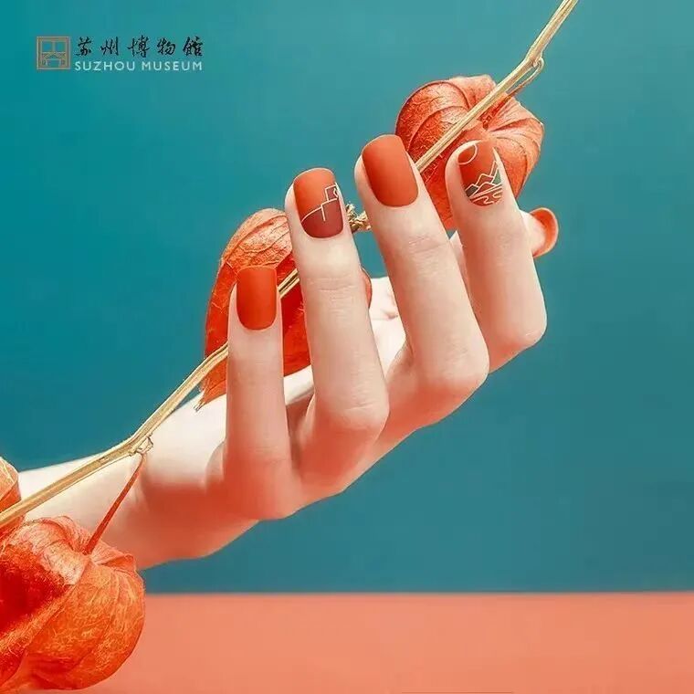 美甲贴灵感来源于苏州博物馆建筑、馆藏沈周画作、忠王府梁桁荷花螳螂图。用高级的色彩搭配,以烫金的形式体现在指甲贴上,让不少精致少女看完两眼放光。