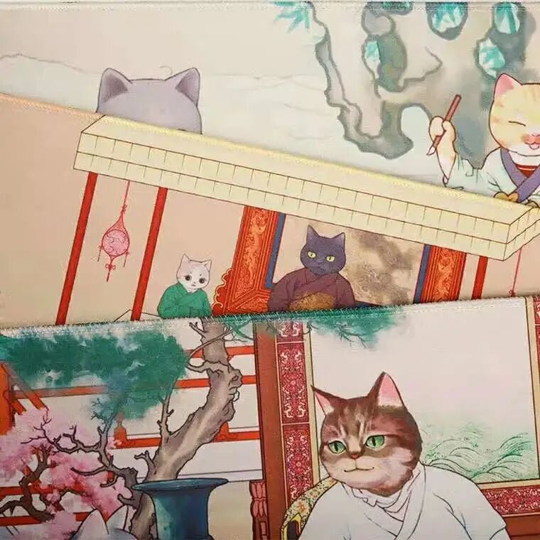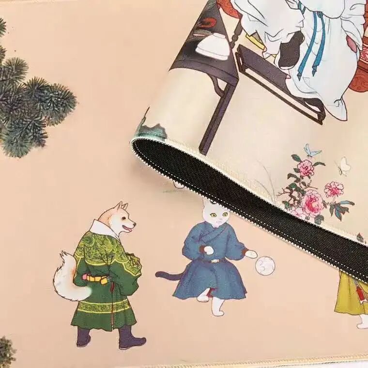 观复博物馆收养了很多猫咪,观博文创将它们萌萌的卡通形象融入古画做成桌垫,也是设计感满满!