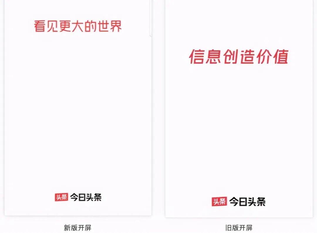 作为BAT搅局者的今日头条slogan也是经历了几轮更换。2012年,与今日头条APP一起出现的,还有“你关心的,才是头条”这句Slogan;直到2018年5月,才更换为“信息创造价值”;2020年再次更换为“看见更大的世界”。