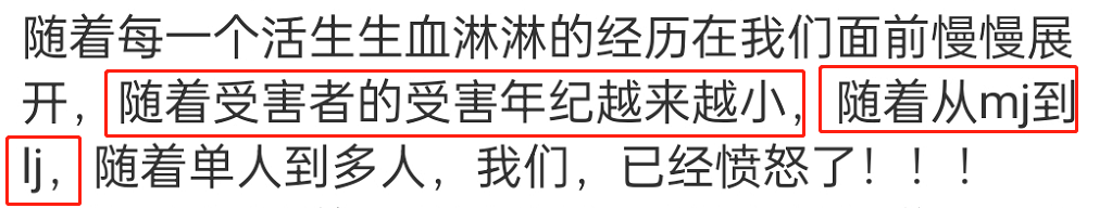 8、受害者年龄越来越小,从mj到lj,从单人到多人切中要害,指出侵犯未成年,将情感问题延伸为社会问题。