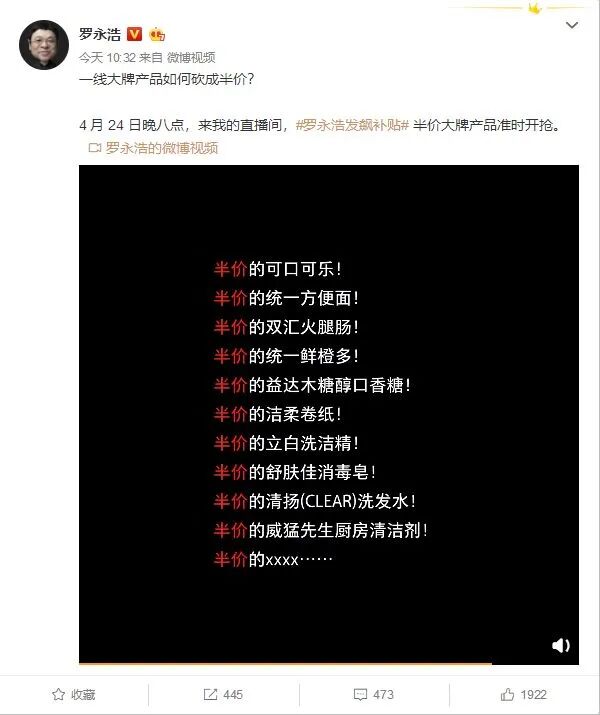 如果说“翻车”只是直播中的小插曲,那么流量和销售额的下滑则可以说是致命的硬伤。因为这意味着,罗永浩很难获得供应商的最低折扣,尤其对方是知名品牌的时候。为了挽救不断下滑的流量和销售额,罗永浩选择了频繁的“制造话题”。4月9日,罗永浩通过官方微博宣布,将首场直播得到的360万元打赏全部用来补贴湖北当地果农,消费者只需一分钱就能够买到五斤橙子,而且包邮;4月10日,罗永浩携手长城旗下的哈弗品牌,10台半价哈弗F7亮相抖音直播间。到了第四场直播,罗永浩干脆“发飙补贴”,将一批一线快消品牌全部砍成半价,回馈粉丝直播间,包括我们熟知的可口可乐、统一、双汇、洗发水、洁柔等等产品。否则,很难解释为何与薇娅、李佳琦相比,罗永浩需要经常借助于“热搜”的力量,为自己创造热度,吸引更多的粉丝关注。甚至,不惜通过“史无前例”的折扣,跟私生活混乱的艺人抢头条。