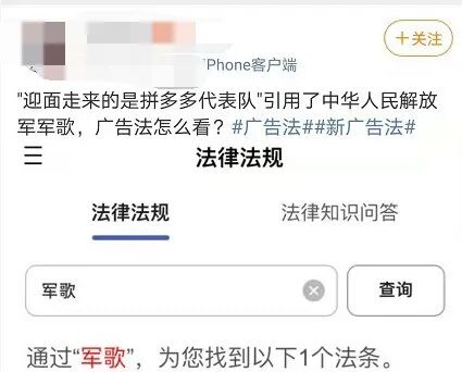 如今拼多多广告,同样面临着相似的问题。由于其在广告中引用军歌,加上这本身就是一种商业行为,是否存在违反广告法的风险,目前都还不好说。