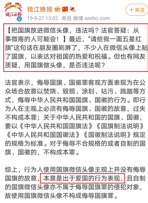 之前“请给我一面国旗 @微信官方”创意刷屏,就有人提出疑问,给头像上贴个小国旗是否违法?
